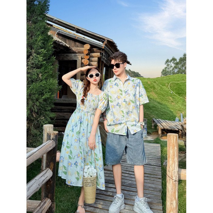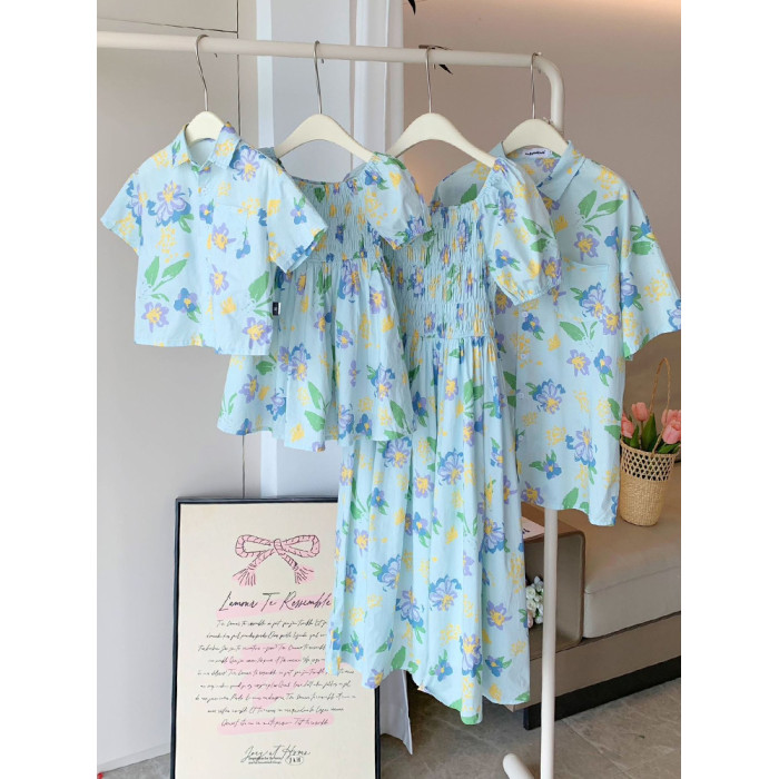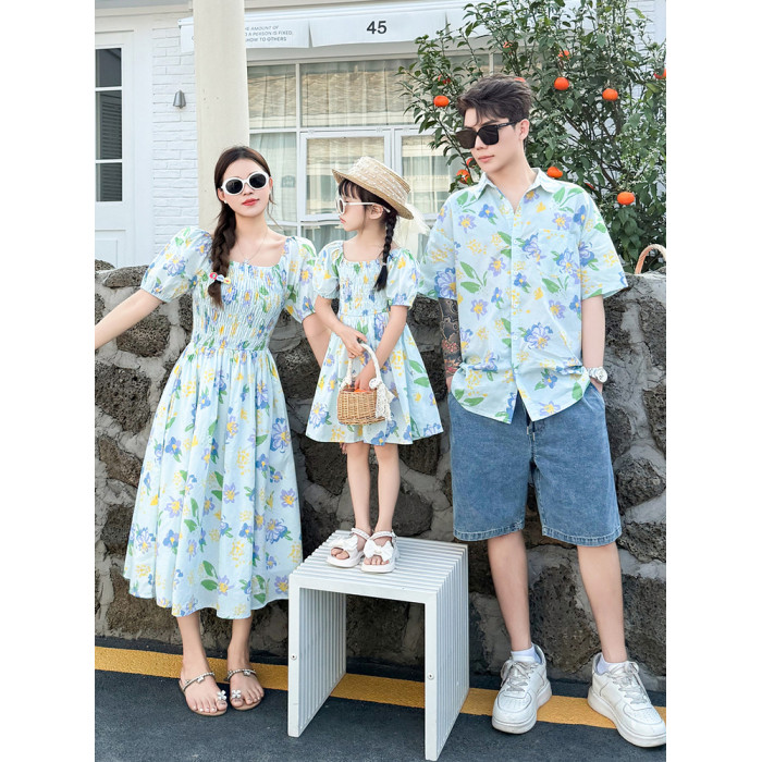 三亞海邊度假親子裝母女裝款夏海灘島一家三口出遊碎花襯衫連衣裙