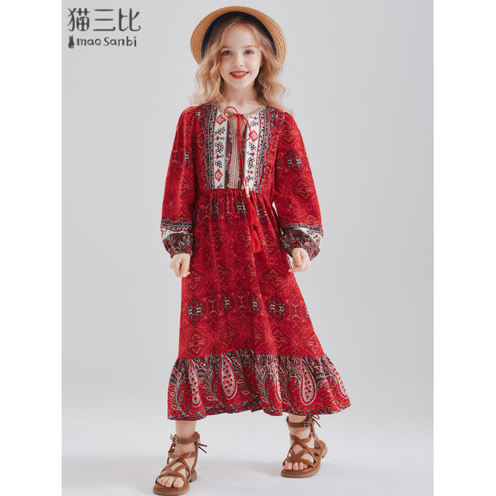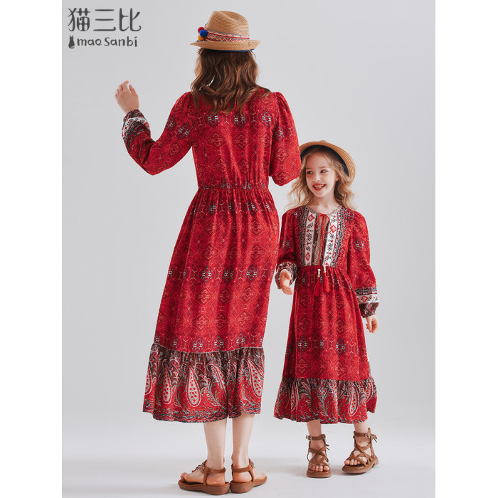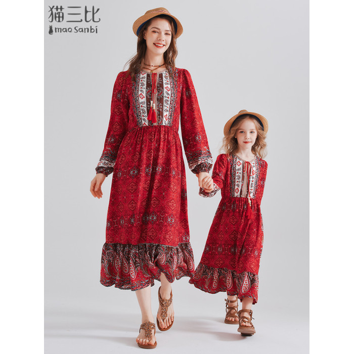 親子裝母女款過膝長裙度假風2025秋季大童裙子草原西藏兒童連衣裙