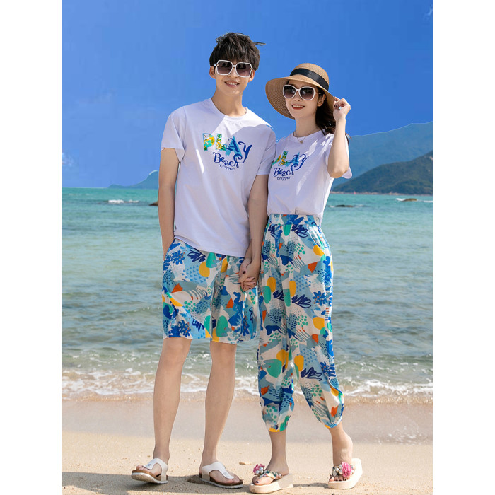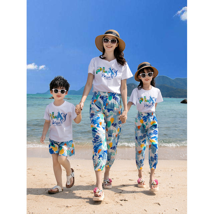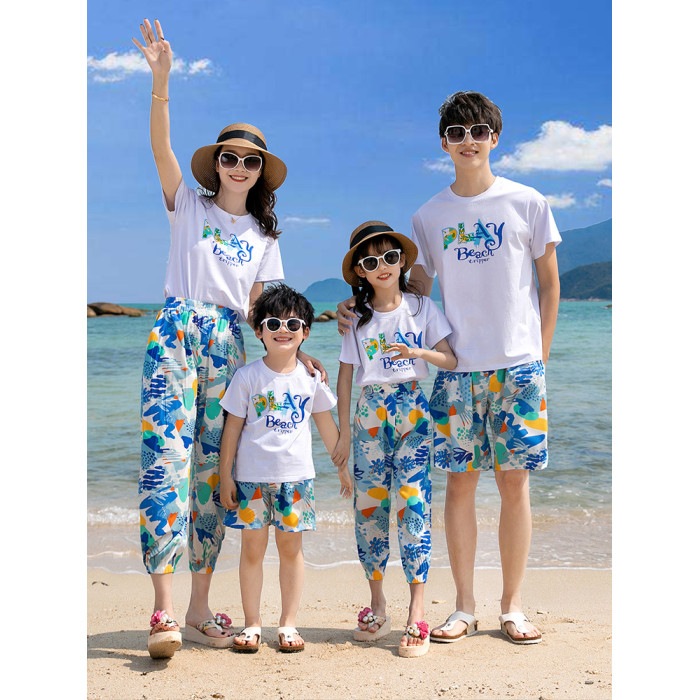 親子裝一家三四口三亞海邊旅遊度假沙灘短袖T恤男套裝連衣裙夏裝