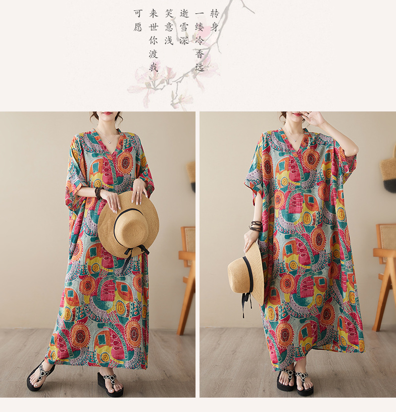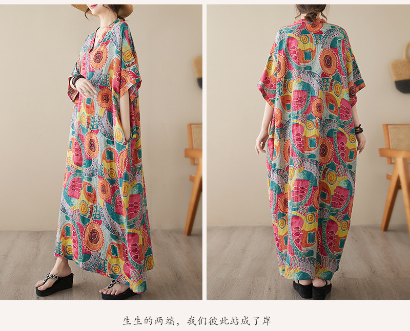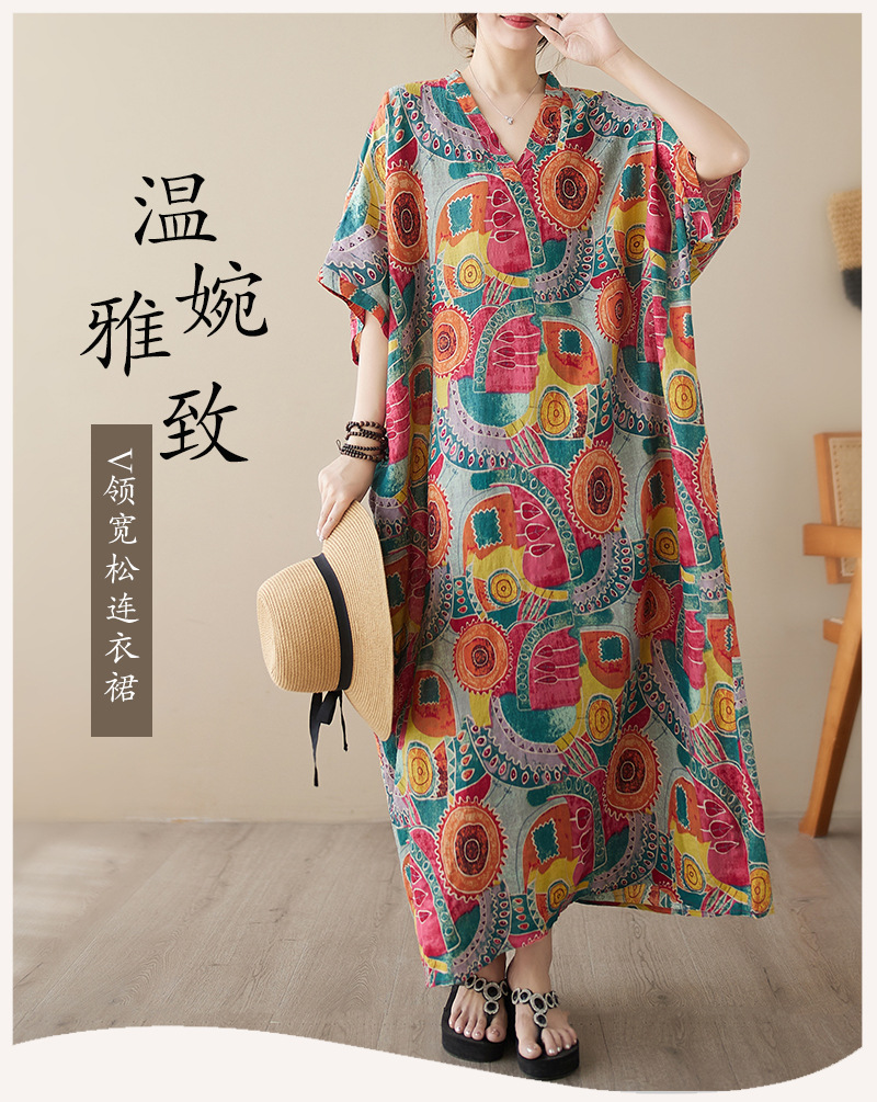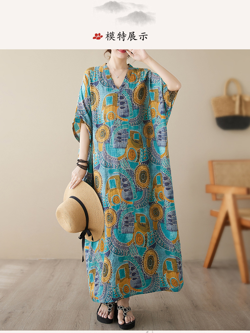 實拍2023年夏季薄款V領棉麻大碼寬松文藝復古度假風沙灘連衣裙女