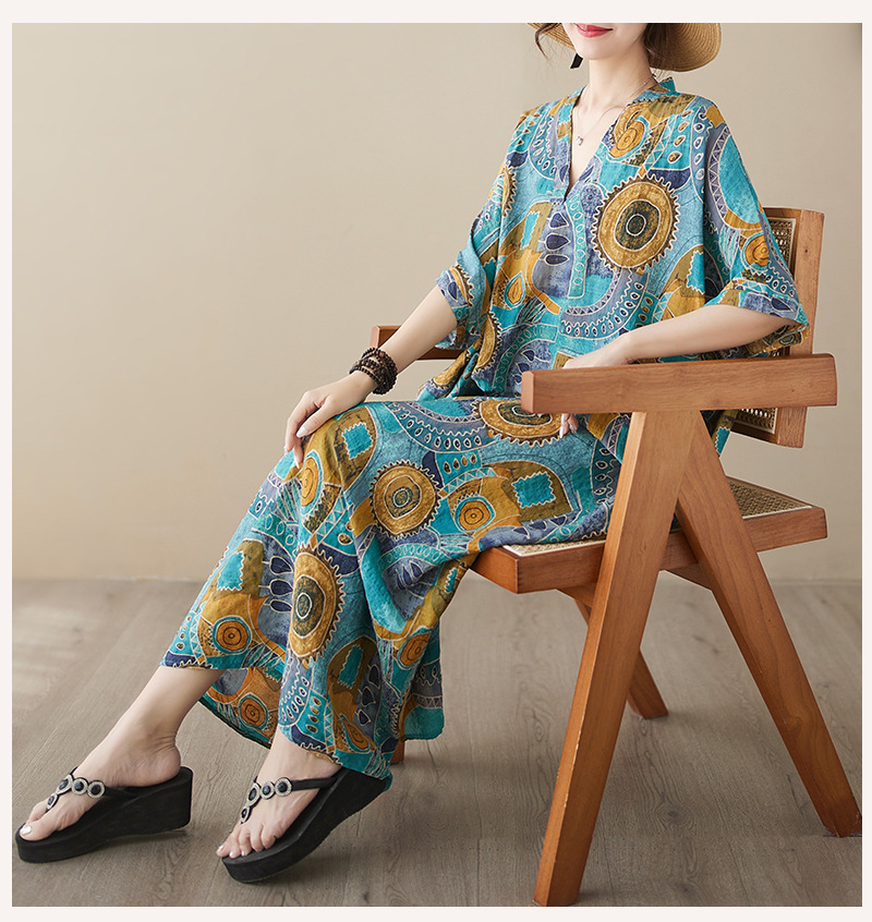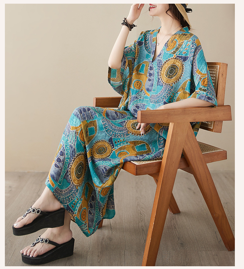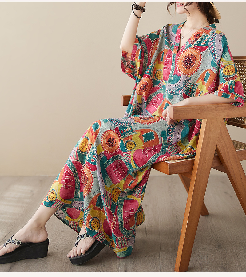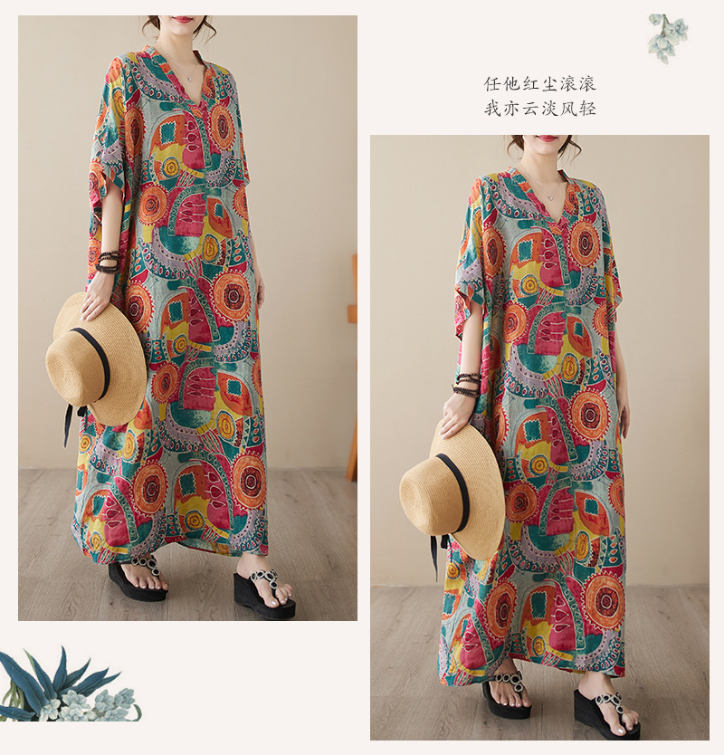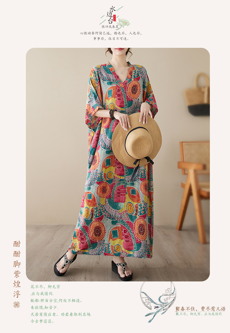 實拍2023年夏季薄款V領棉麻大碼寬松文藝復古度假風沙灘連衣裙女