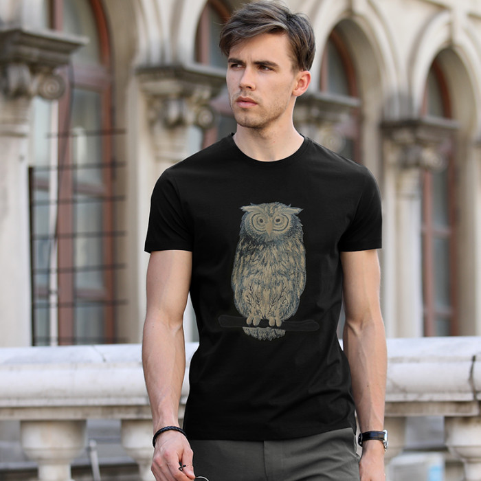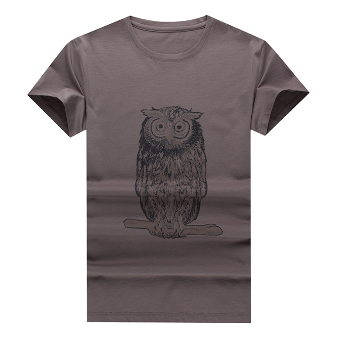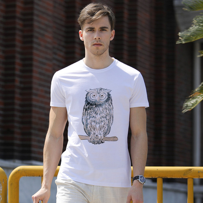 夏季短袖男T恤絲光棉歐美簡約圓領貓頭鷹圖案印花半袖修身體恤男