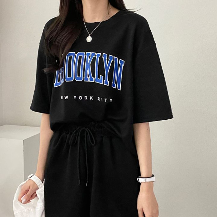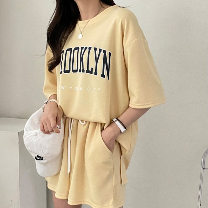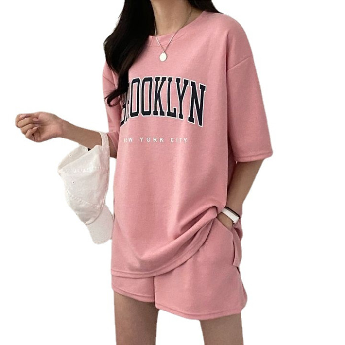 100%含棉短袖短褲套裝女裝兩件套新款夏季時尚休閒運動服蝦米