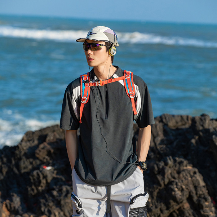 夏季男T恤通勤日系抑菌薄款涼感運動拼接寬松短袖