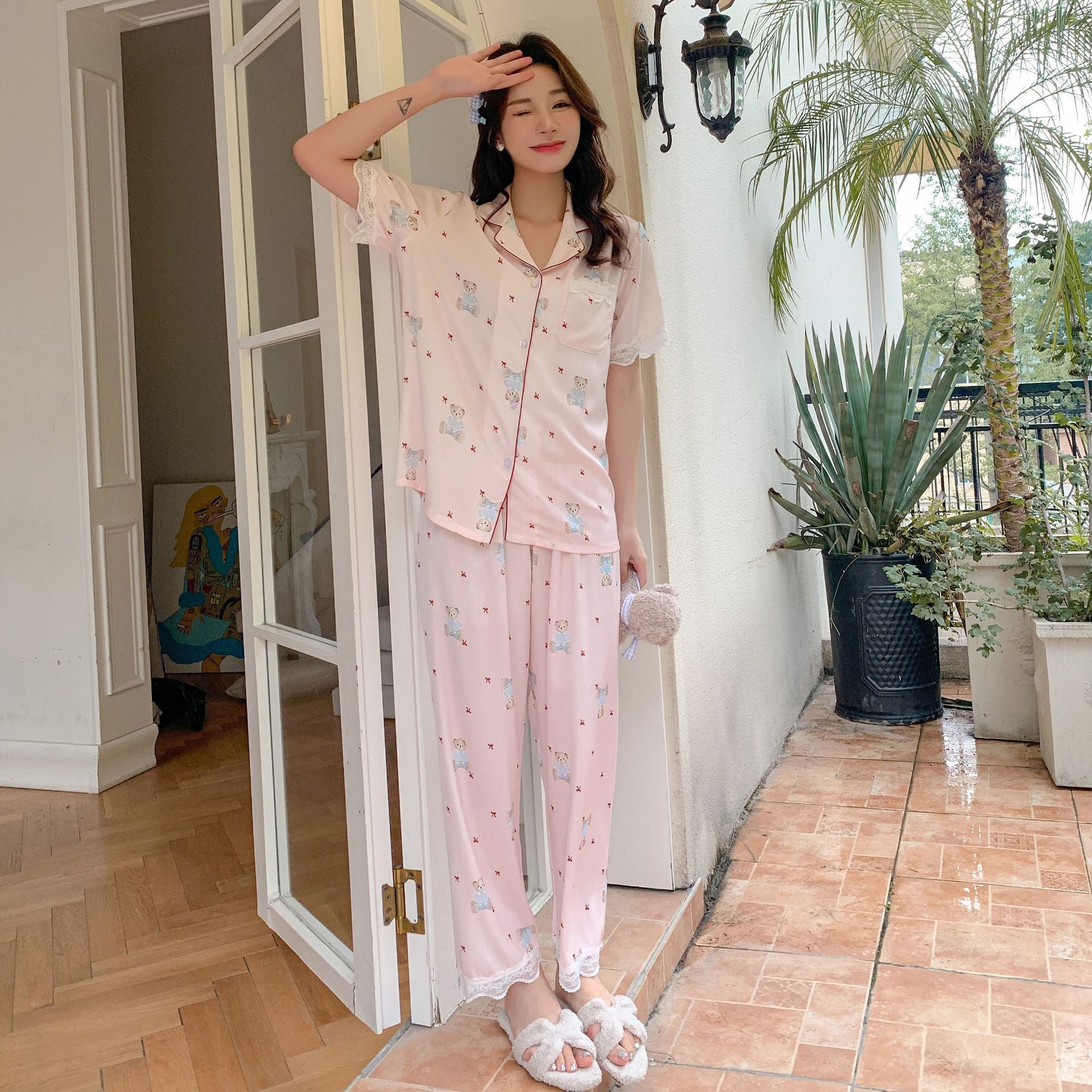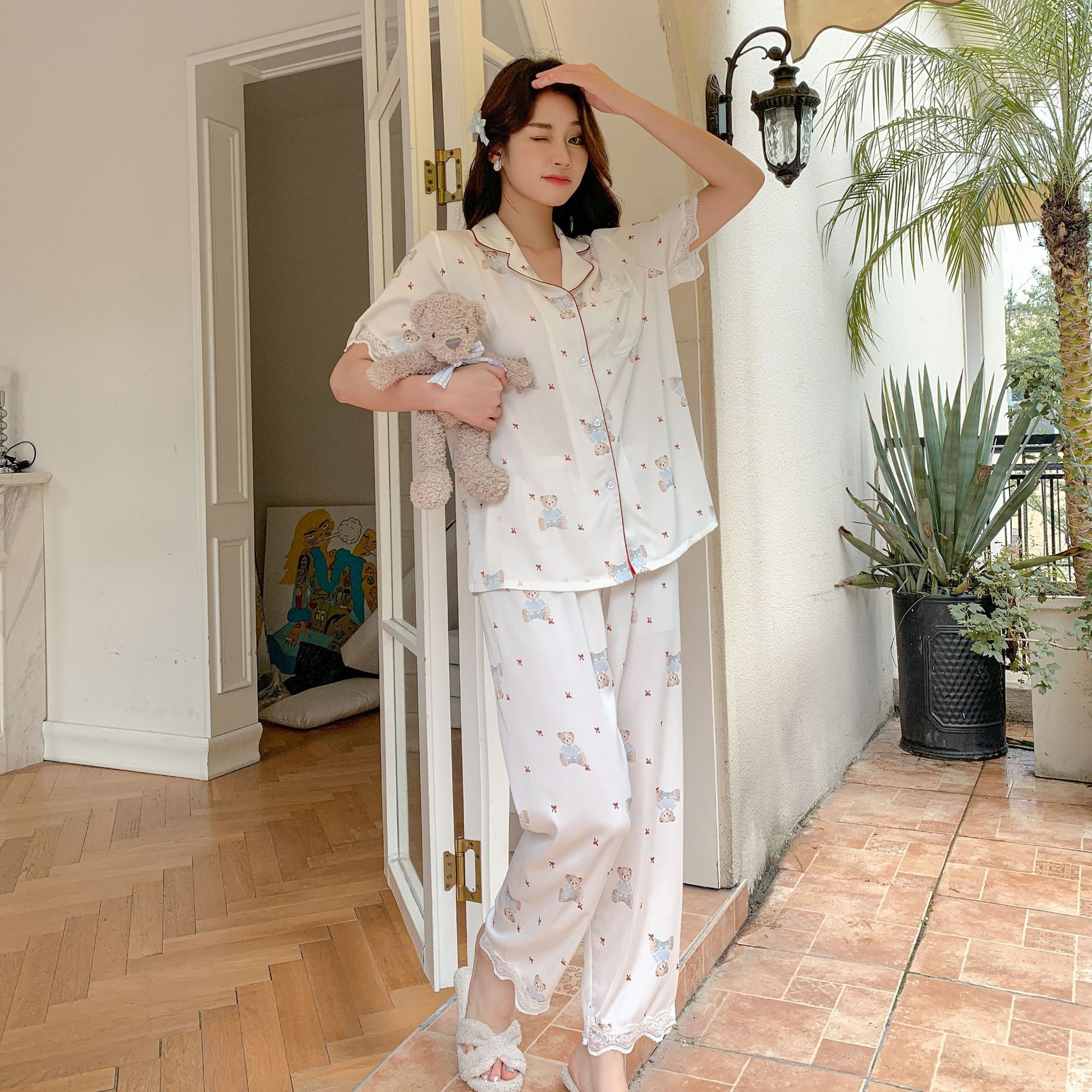 夏秋新款醋酸面料短袖長褲小熊三件套睡衣女簡約休閒可愛風家居服