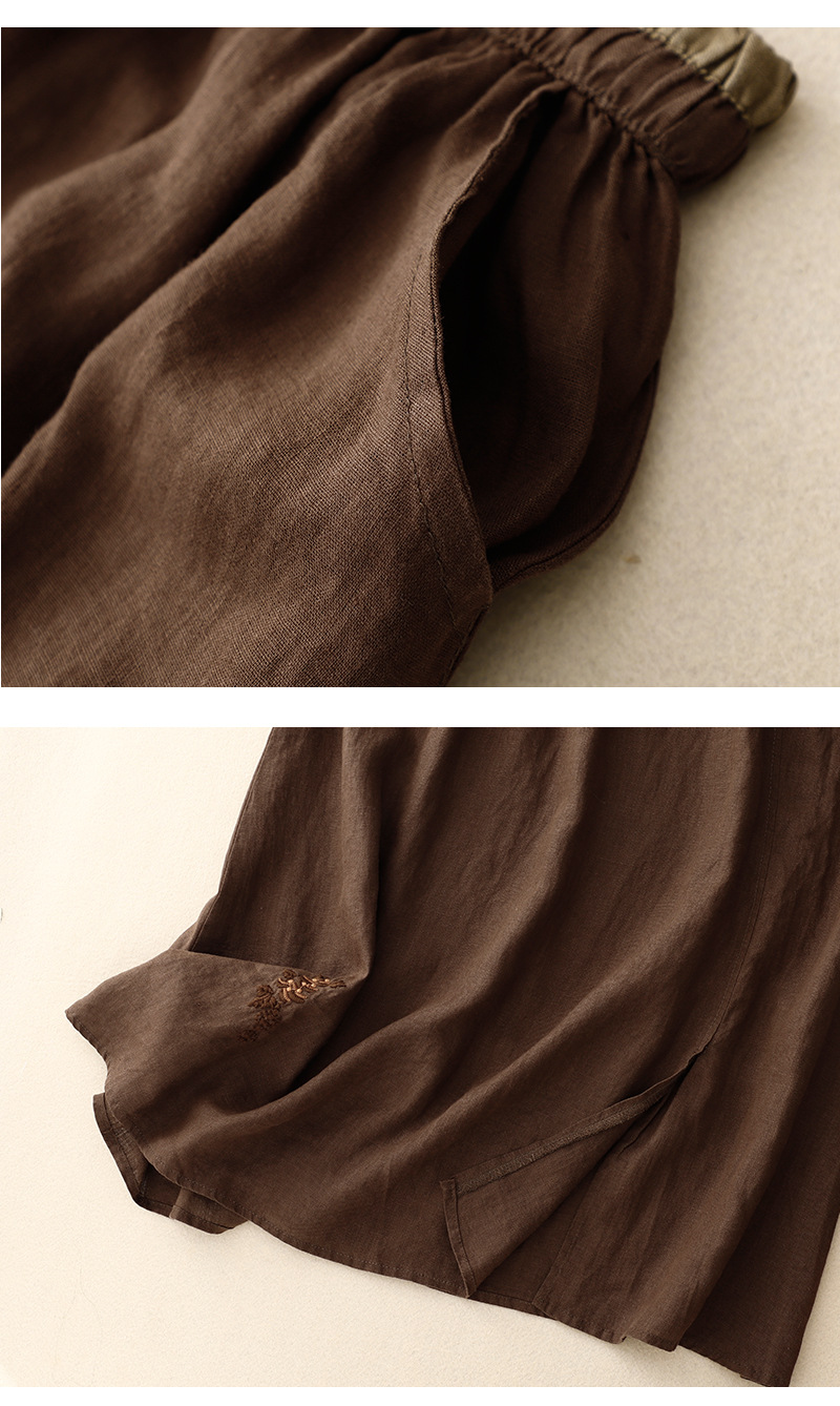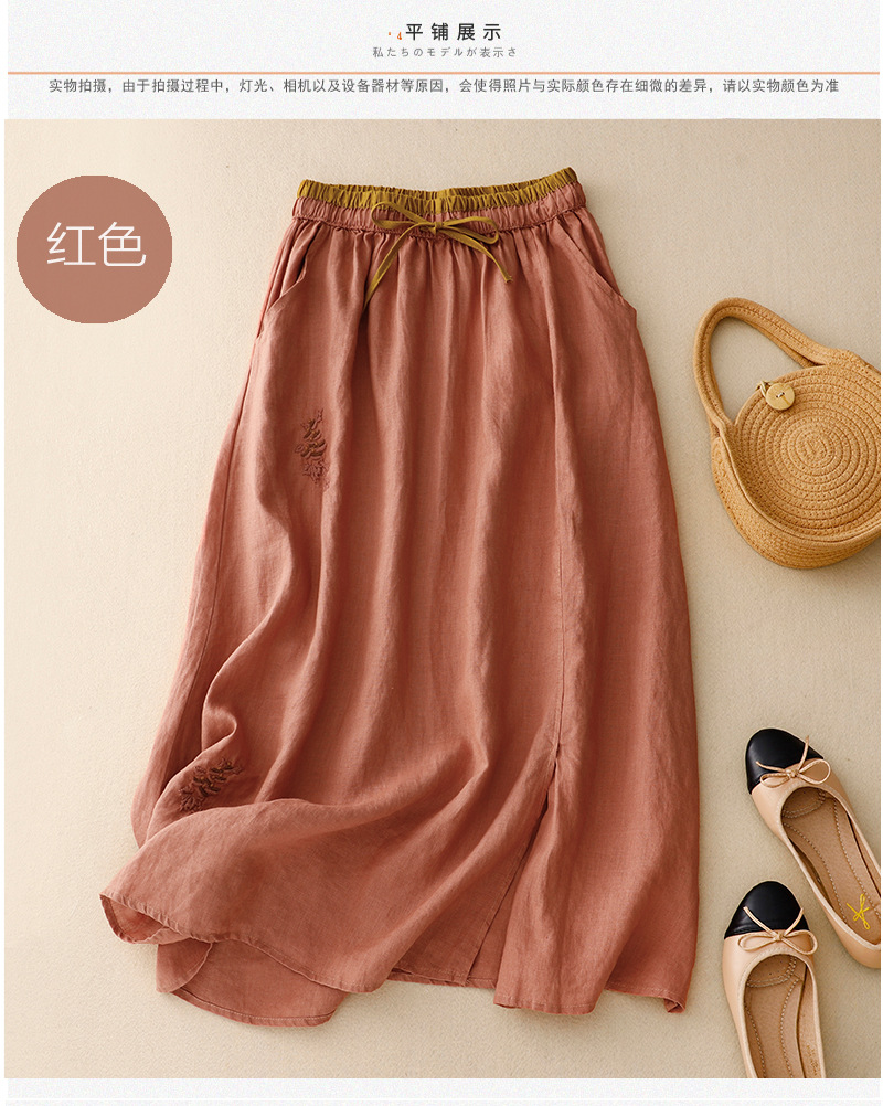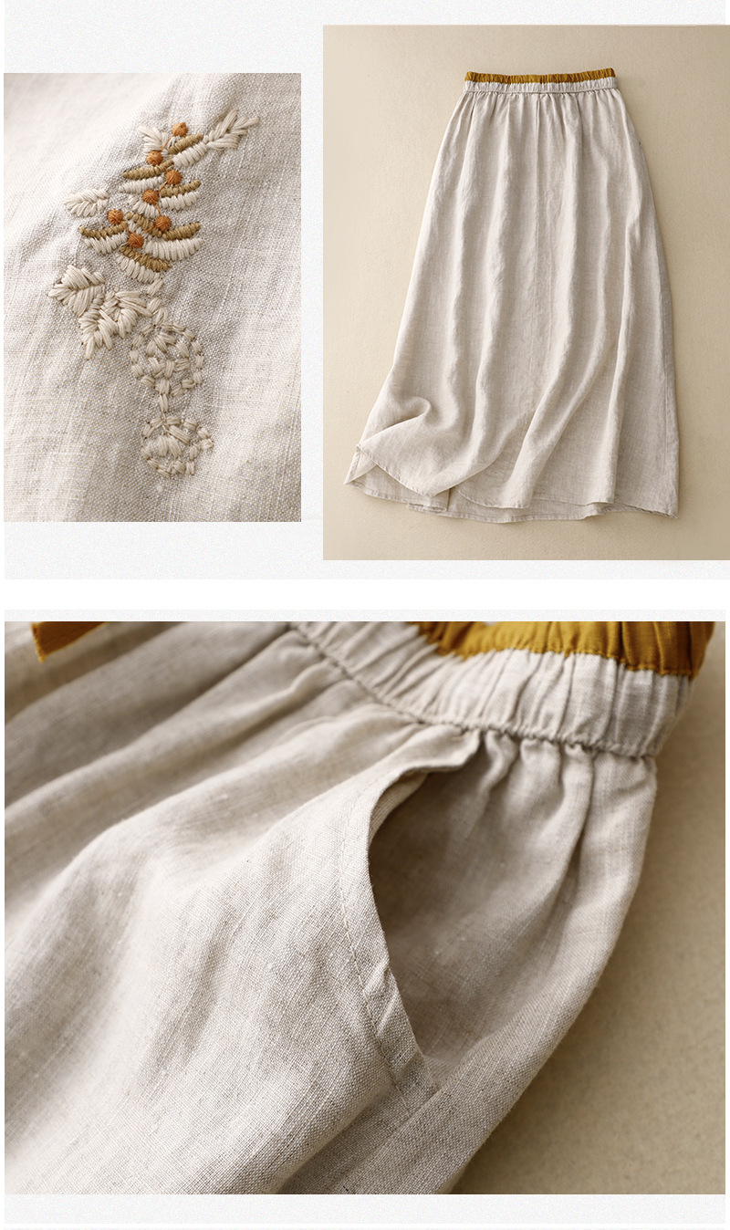 實拍文藝刺綉拼接裙松緊腰拼色a字裙女復古亞麻寬松中長款半身裙