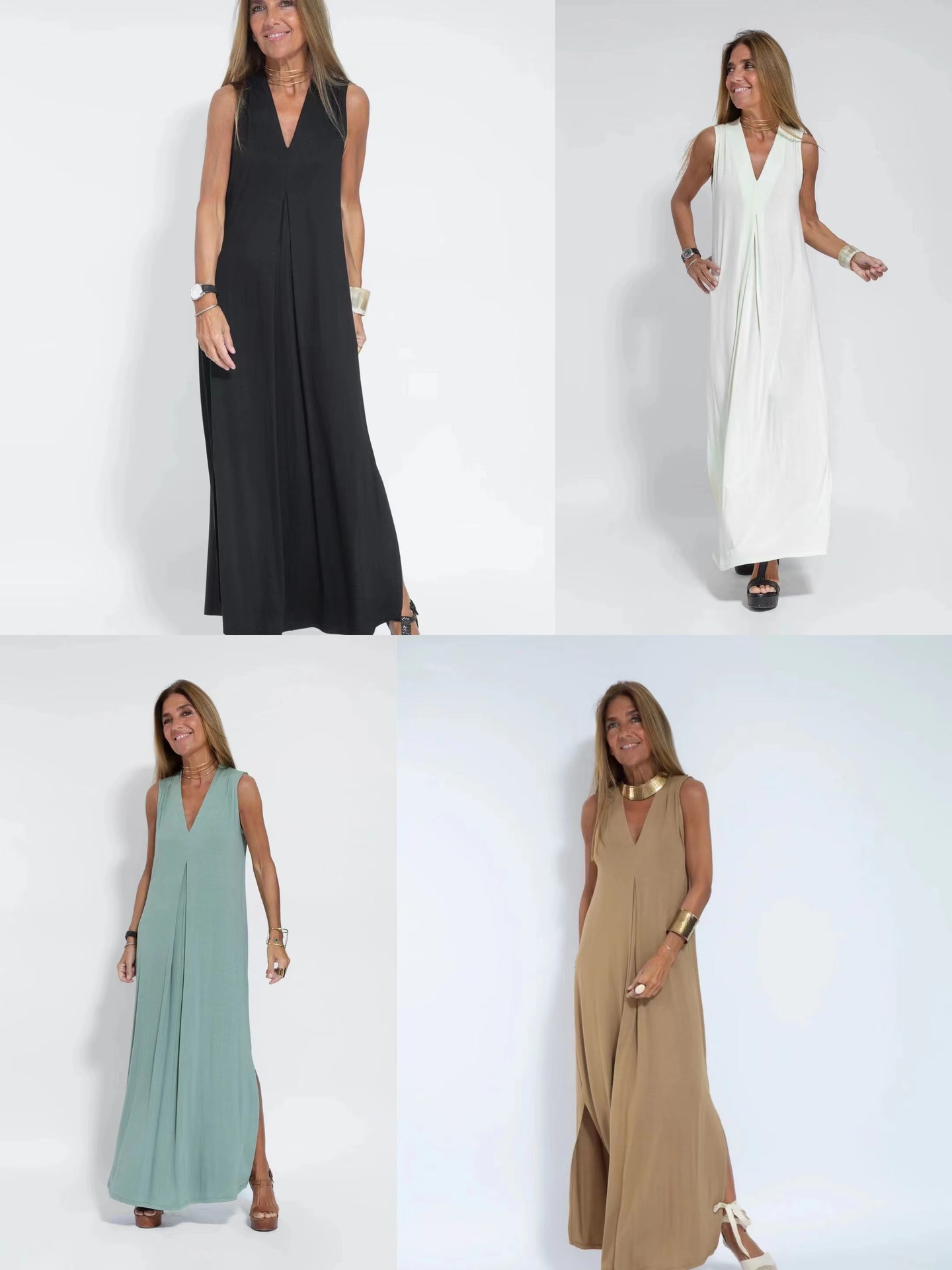 2024夏季新款時尚V領無袖寬松顯瘦簡約拼接長款連衣裙