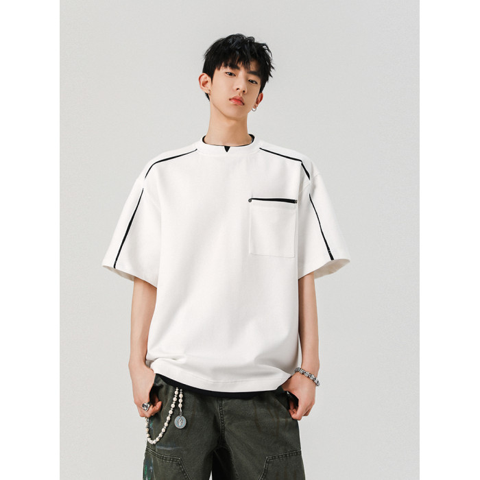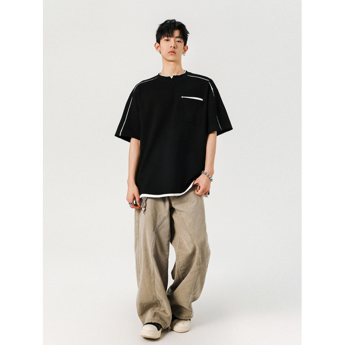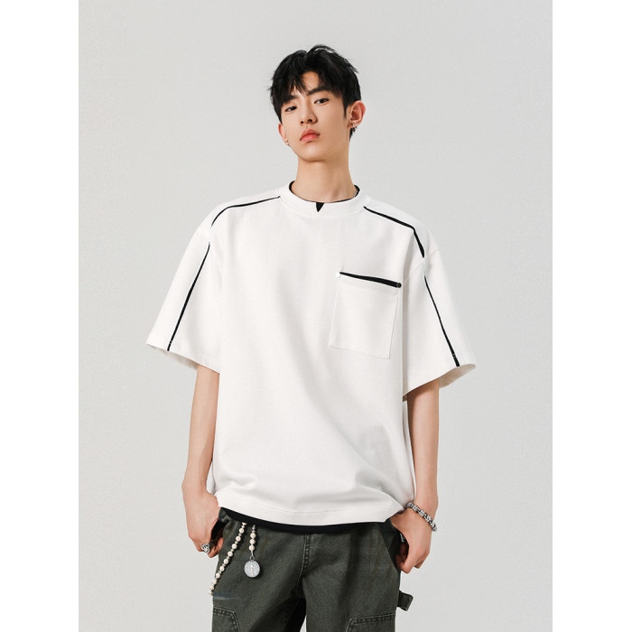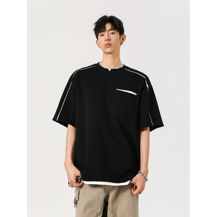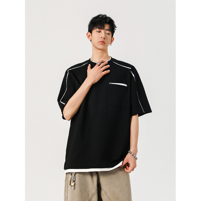 夏季新款涼爽輕柔假兩件上衣短袖男t恤拼接休閒寬松衣服潮牌體恤