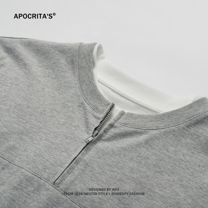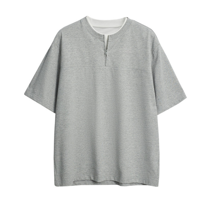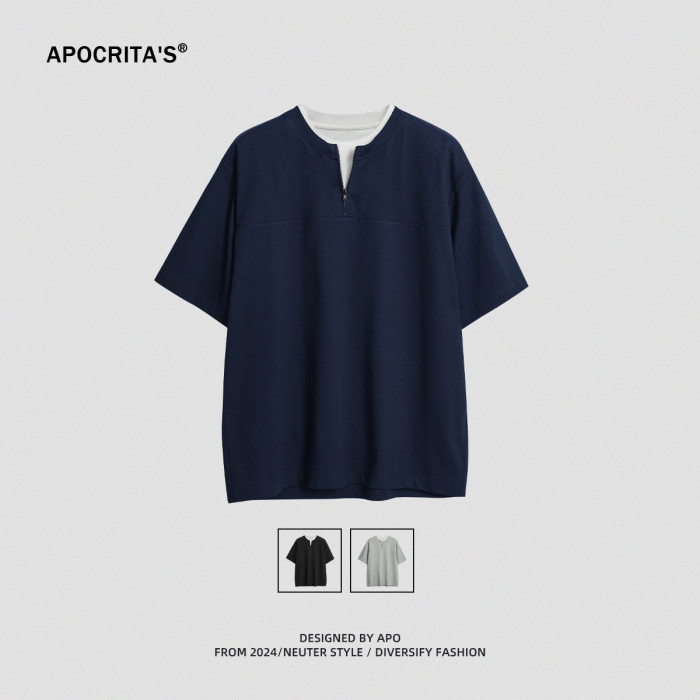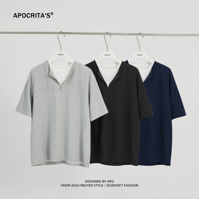 APO男裝 |簡約純色短袖男T恤2025夏季新款拉鍊寬松假兩件拼接上衣