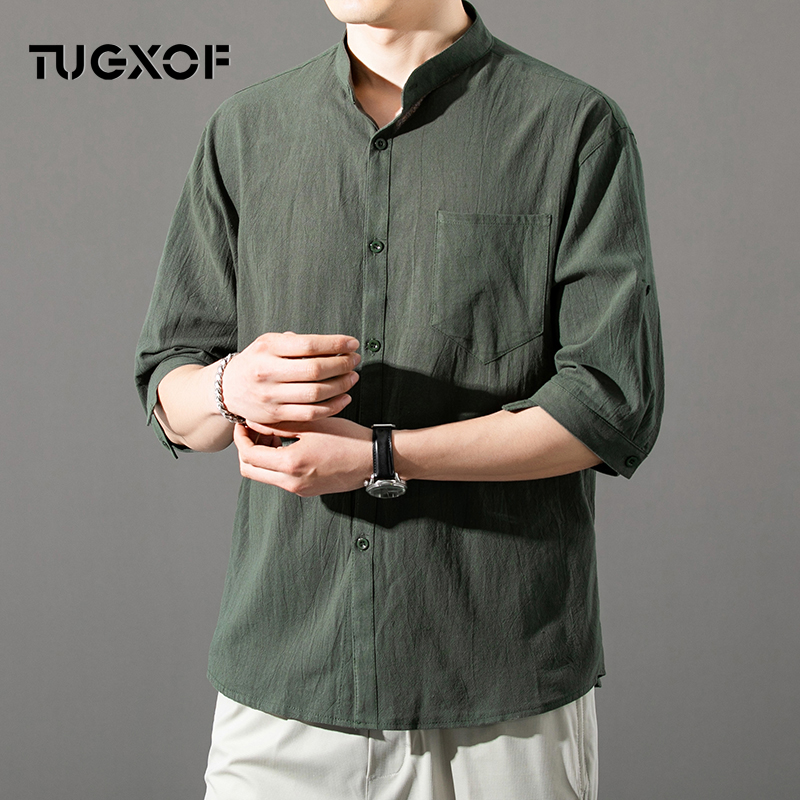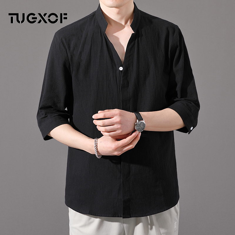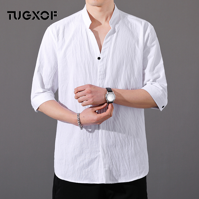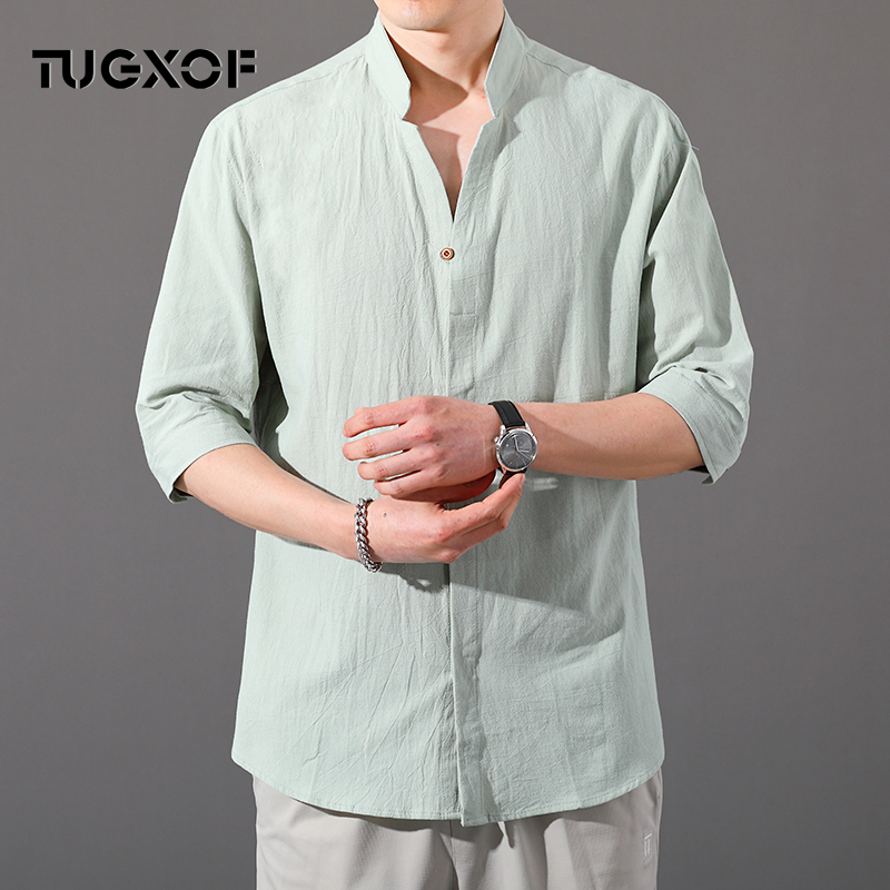 新款棉麻中袖男t恤棉襯衫男士休閒7分袖薄款七分袖亞麻短袖簡約潮