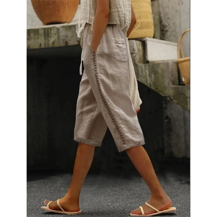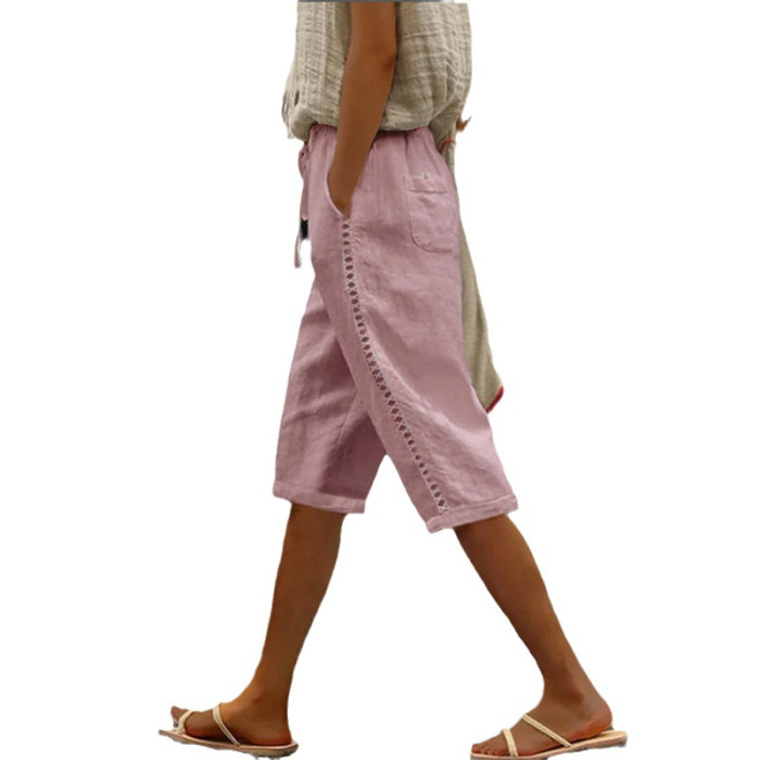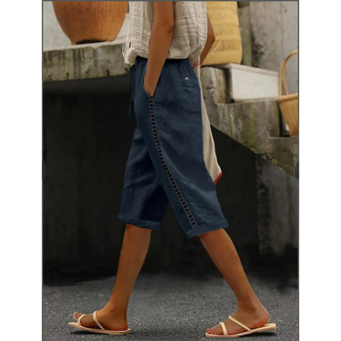 2025夏季新款時尚梭織棉麻側邊蕾絲鏤空休閒五分褲