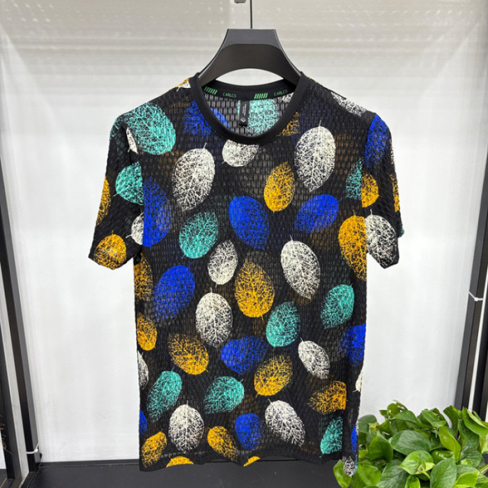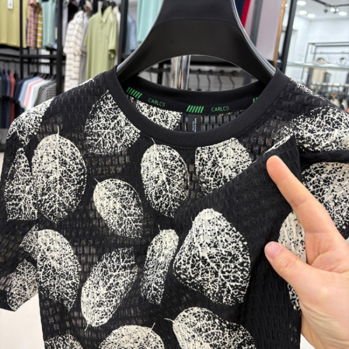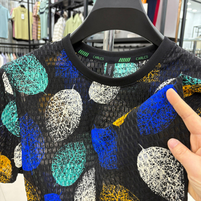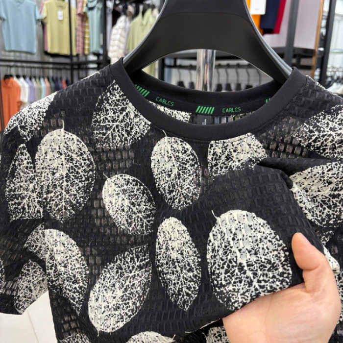 2025夏裝短袖男T恤錦氨面料 鏤空時尚T恤彩色樹葉印花爸爸裝短袖
