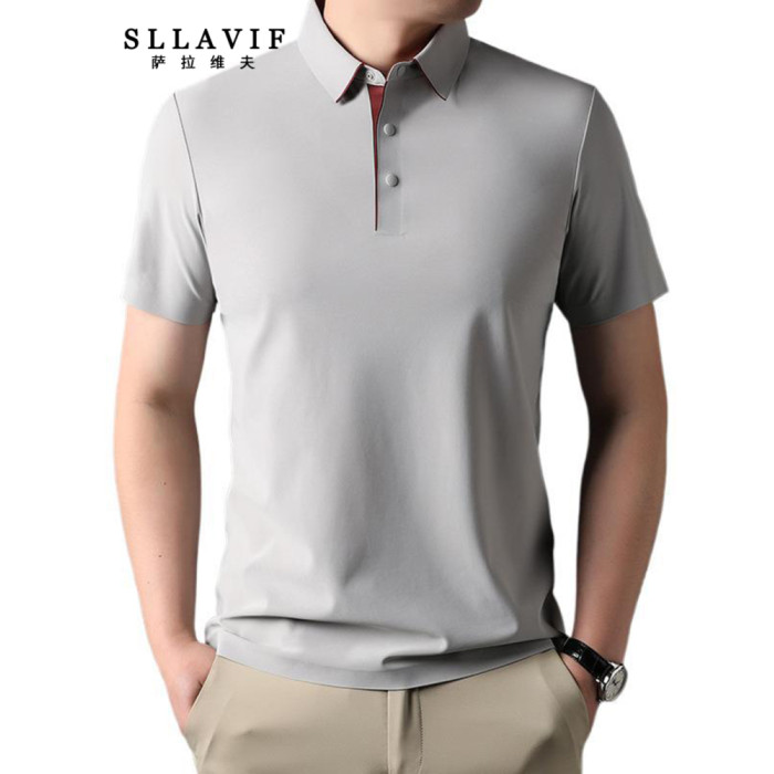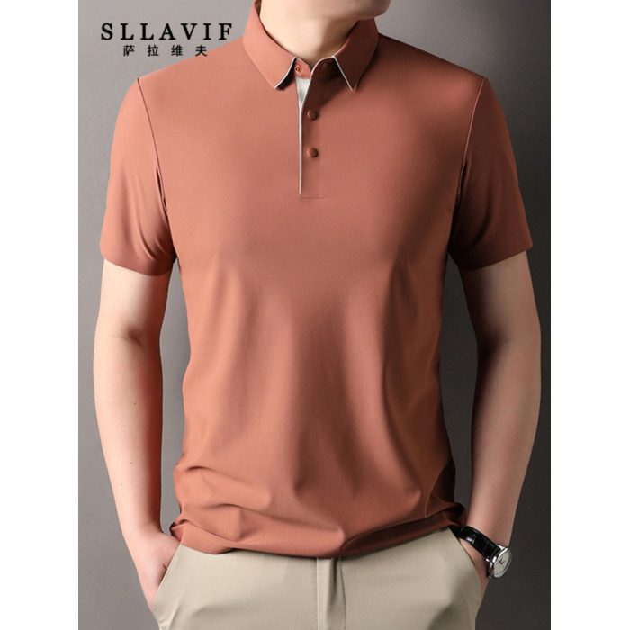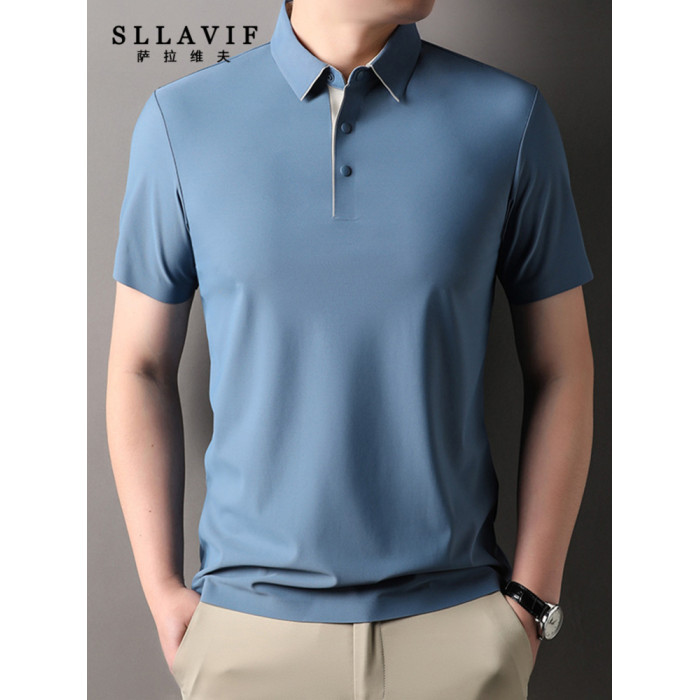 Sllavif高級純色翻領短袖男t恤2025新款夏季中年休閒商務男士上衣