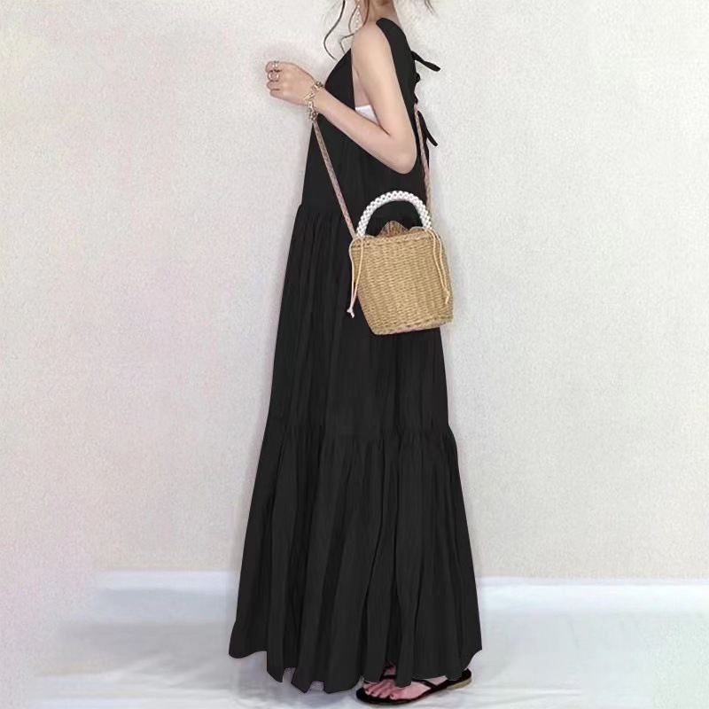 連衣裙2023新款日韓女裝小清晰長裙無袖拼接顯瘦系帶連衣裙