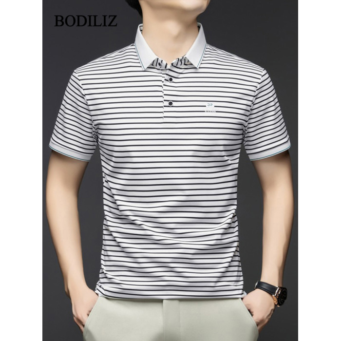高級品牌速乾冰絲條紋白色商務polo衫男短袖t恤中年抗皺涼感體恤