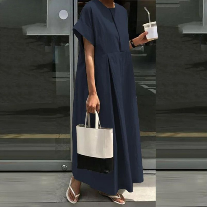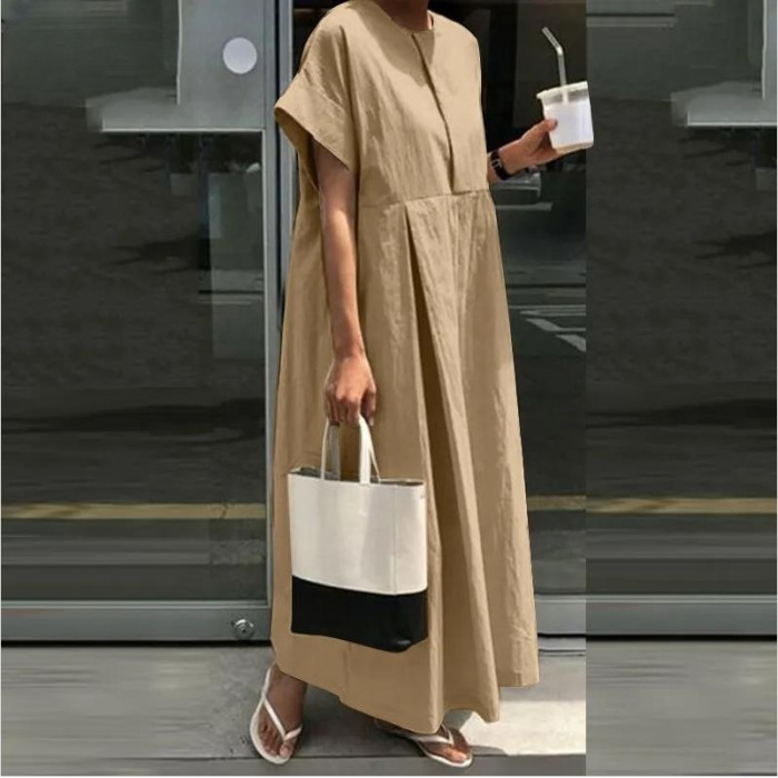 新款大碼寬松棉麻連衣裙圓領長裙氣質學院風森女系打底衫休閒裙