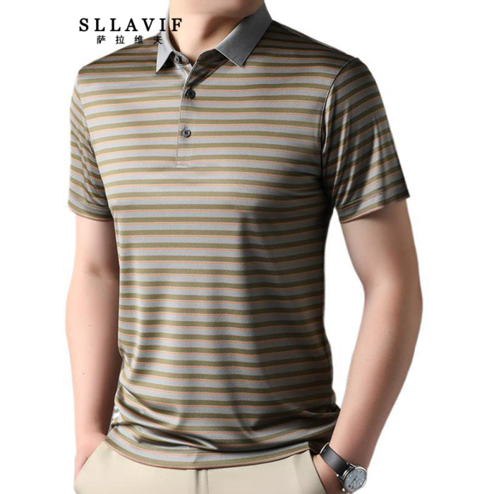 Sllavif輕奢桑蠶絲男t恤2025新款短袖夏季爸爸裝潮流商務休閒衣服