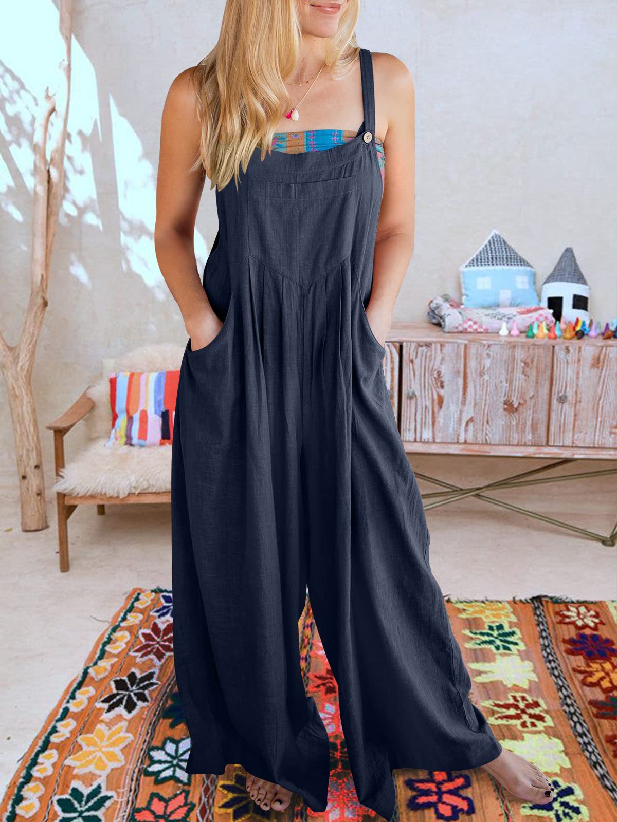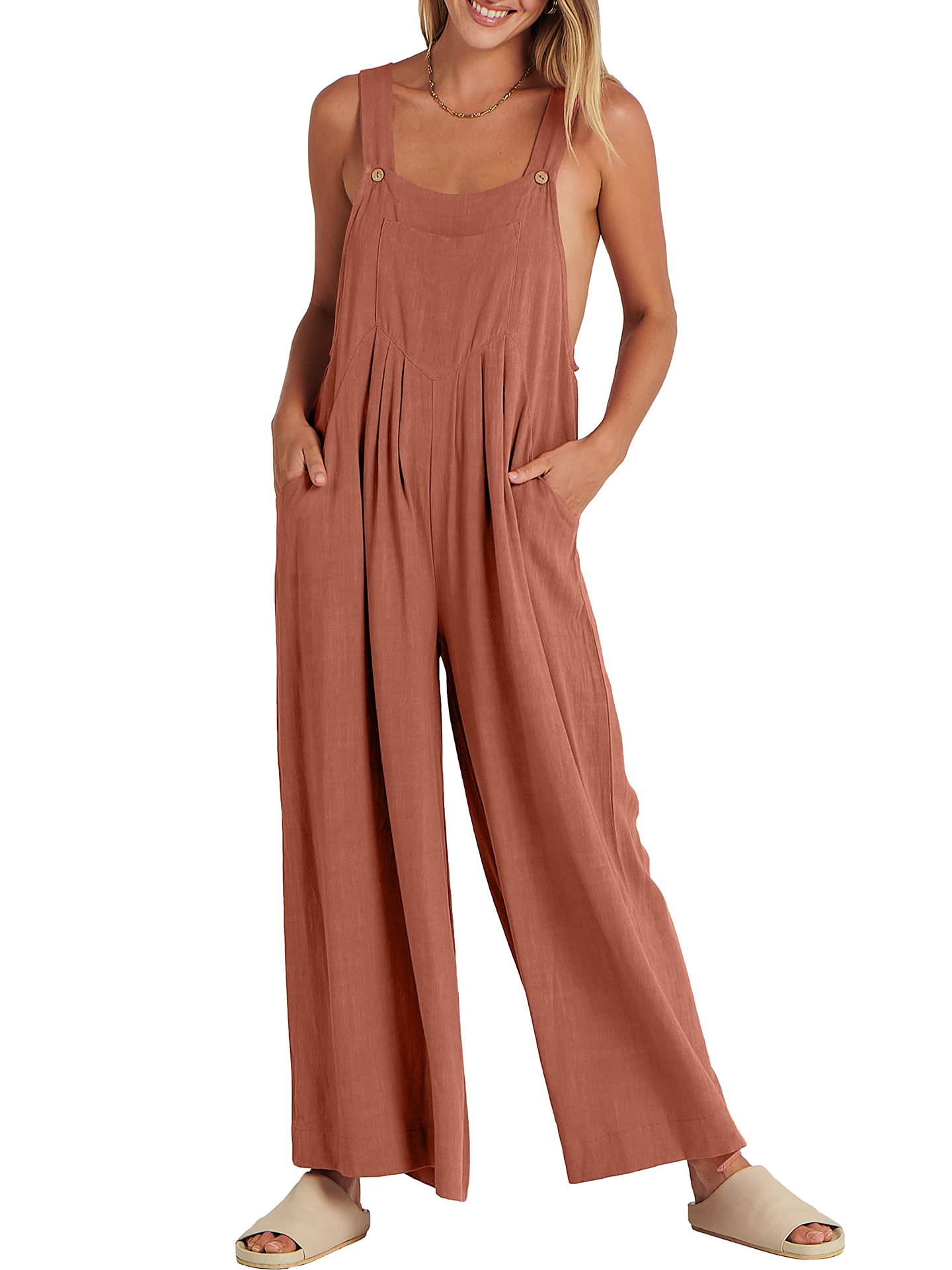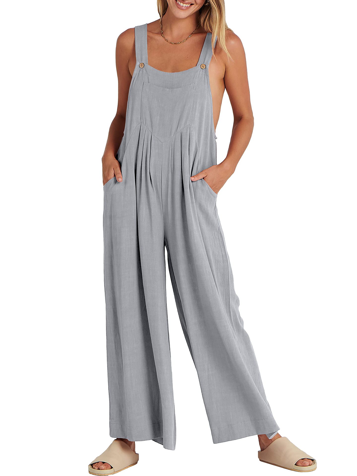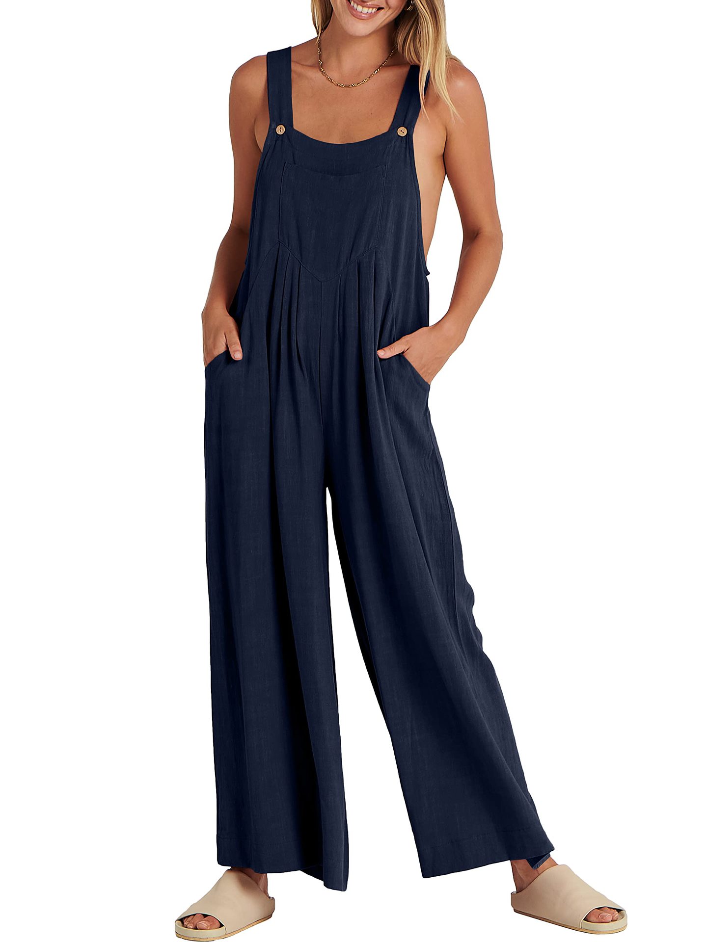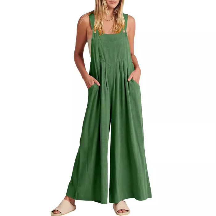 爆款獨立站歐美女士純色寬松休閒棉麻背帶連體褲