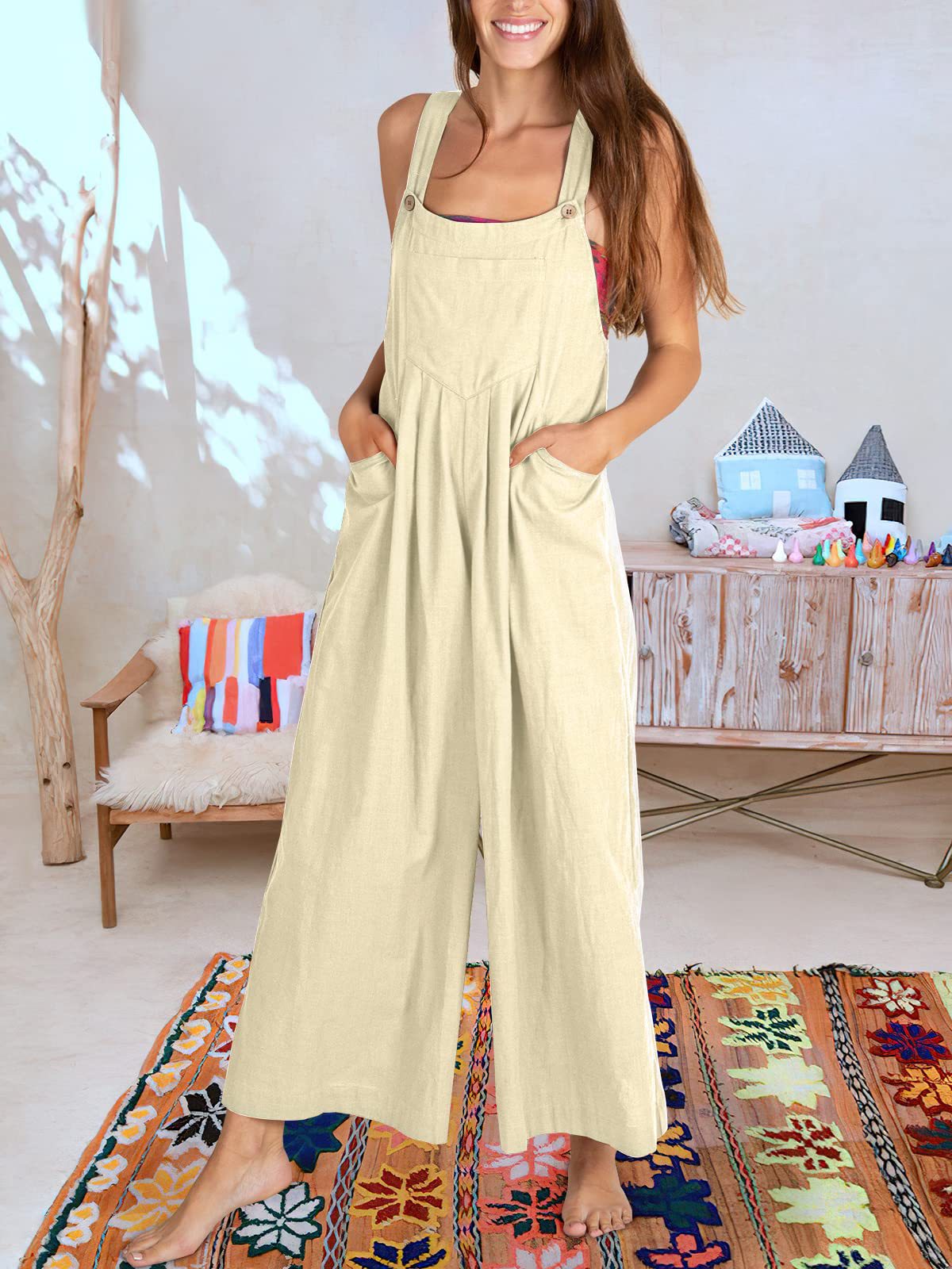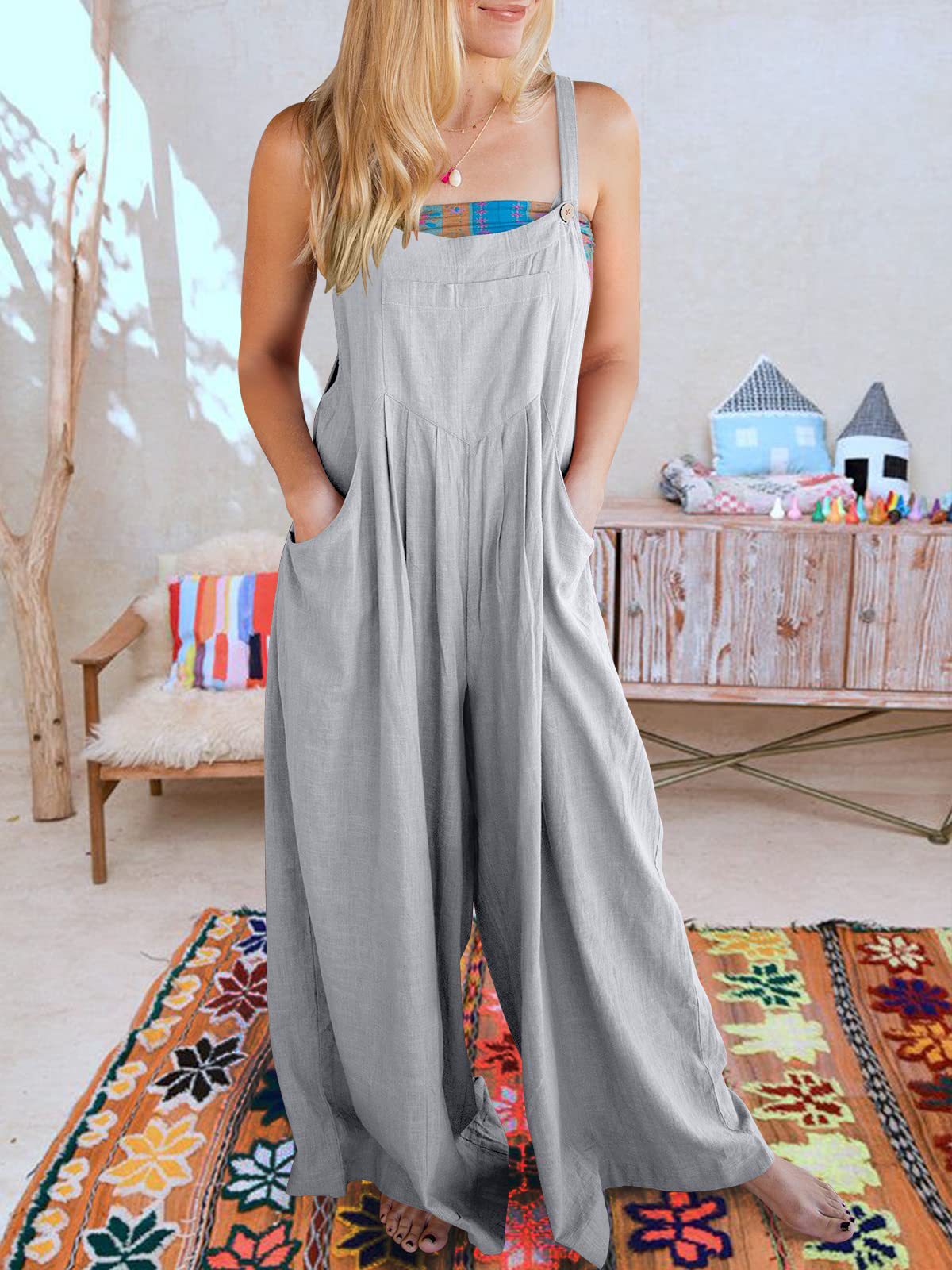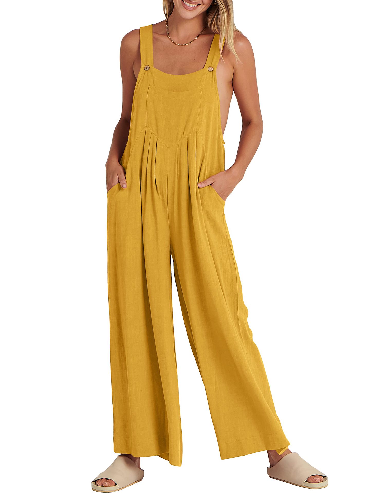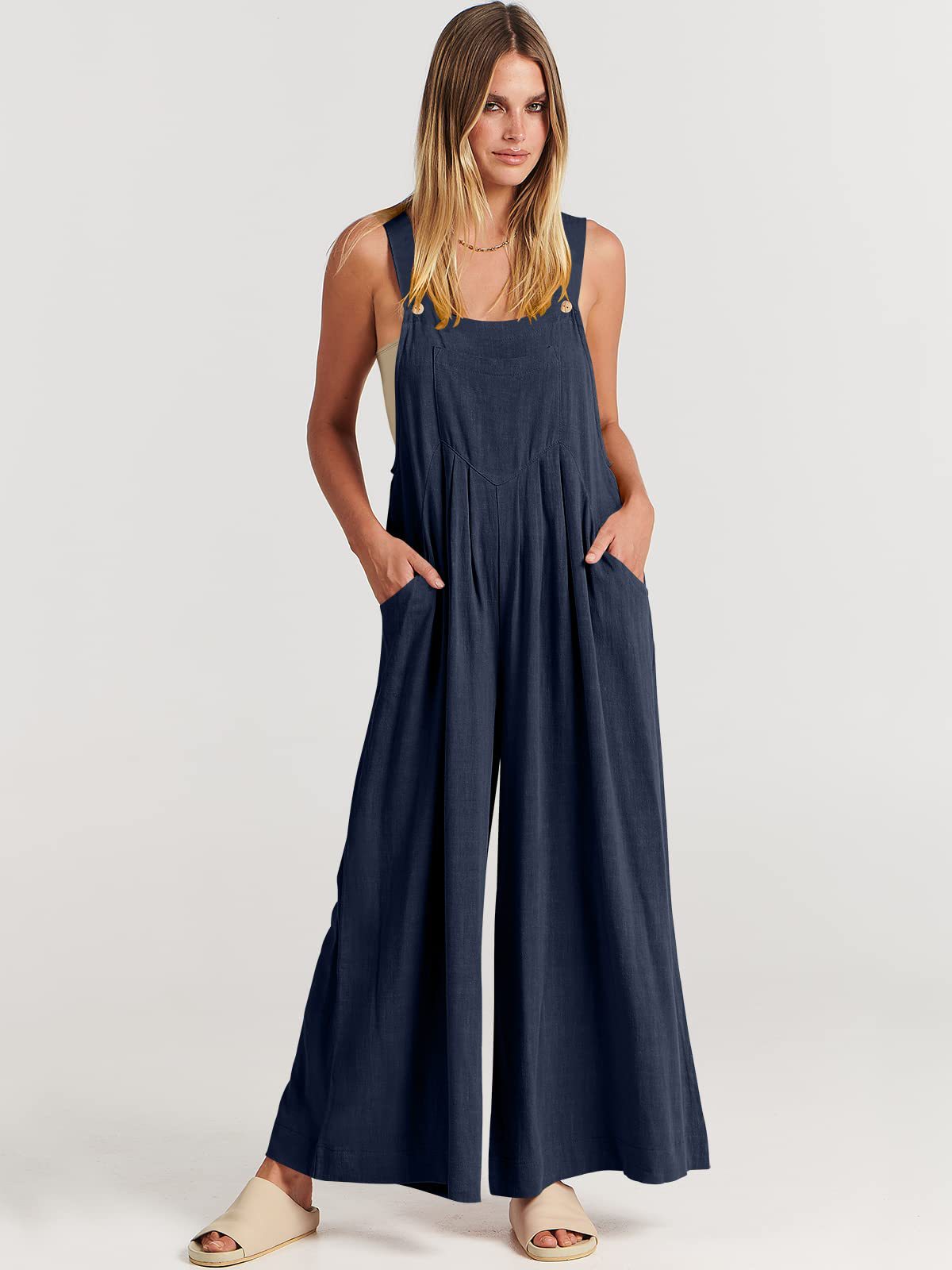 爆款獨立站歐美女士純色寬松休閒棉麻背帶連體褲