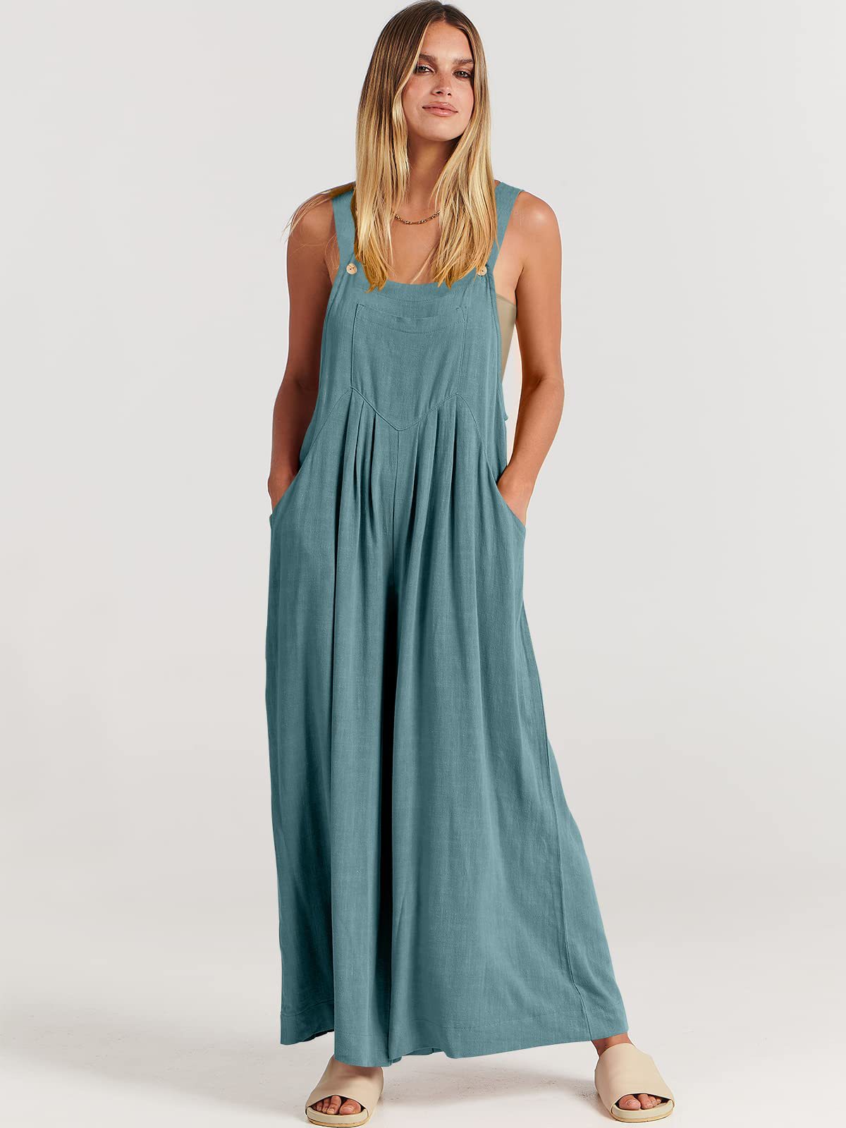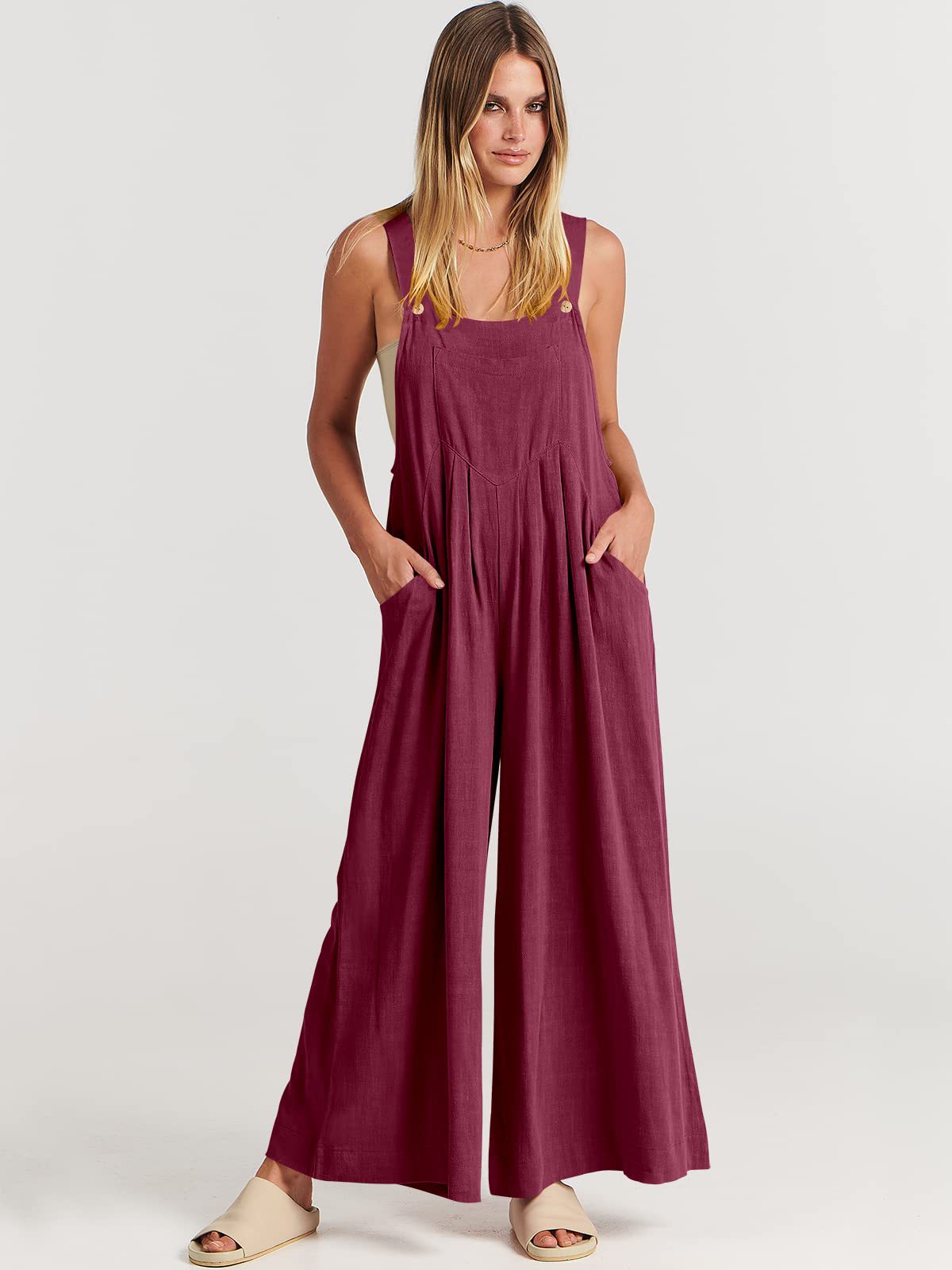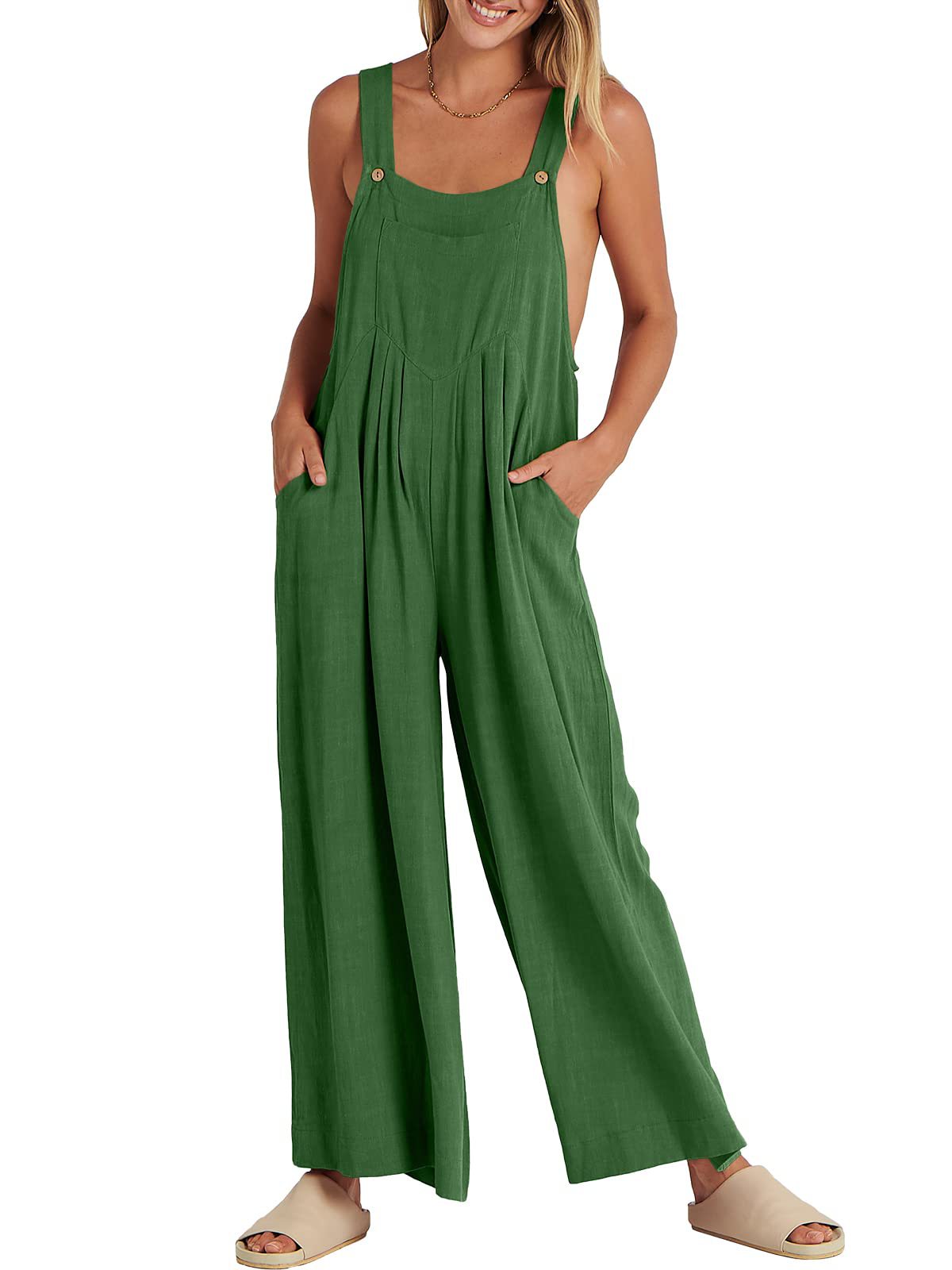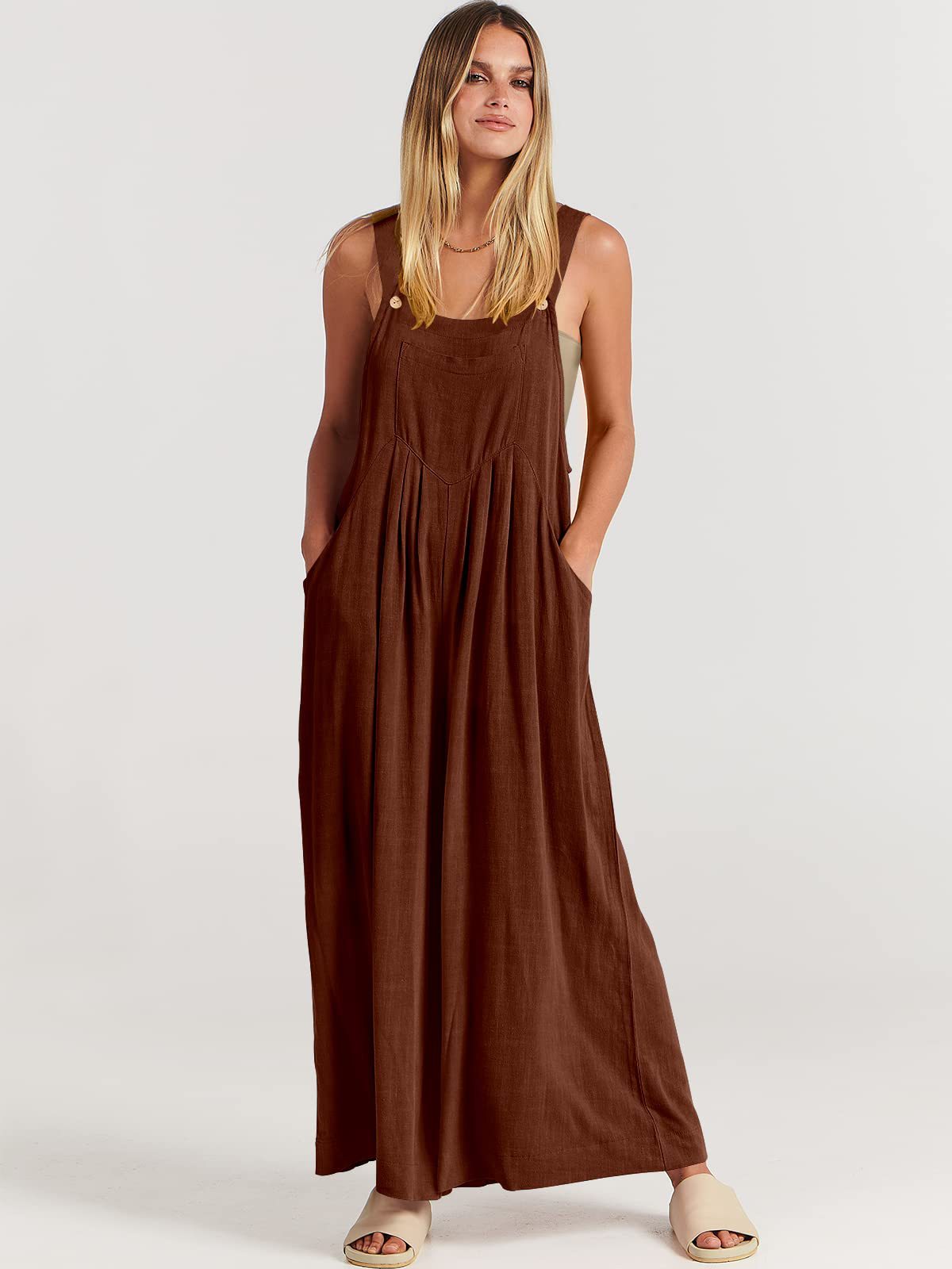 爆款獨立站歐美女士純色寬松休閒棉麻背帶連體褲