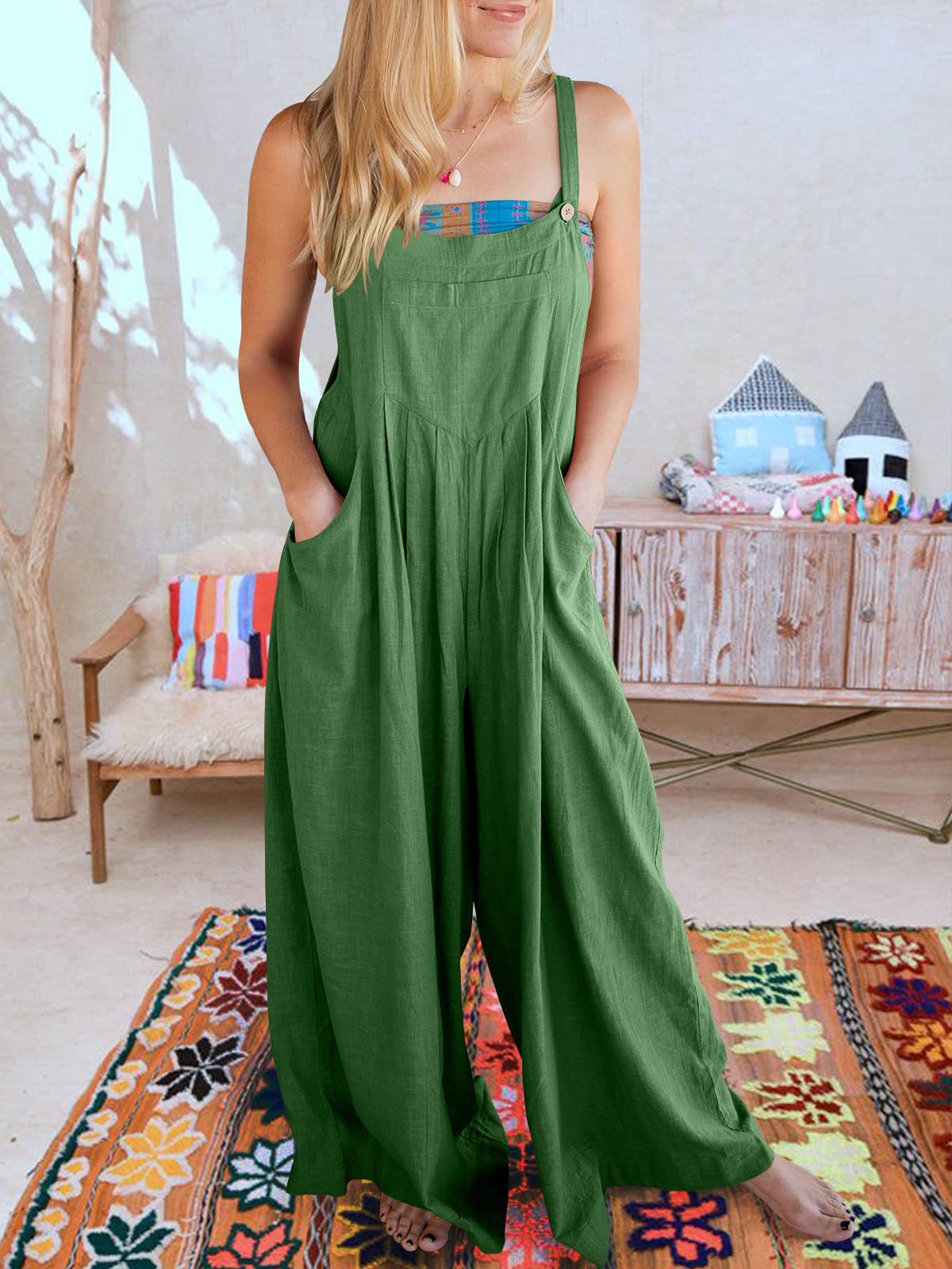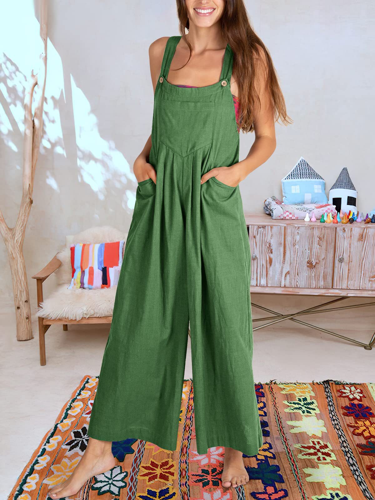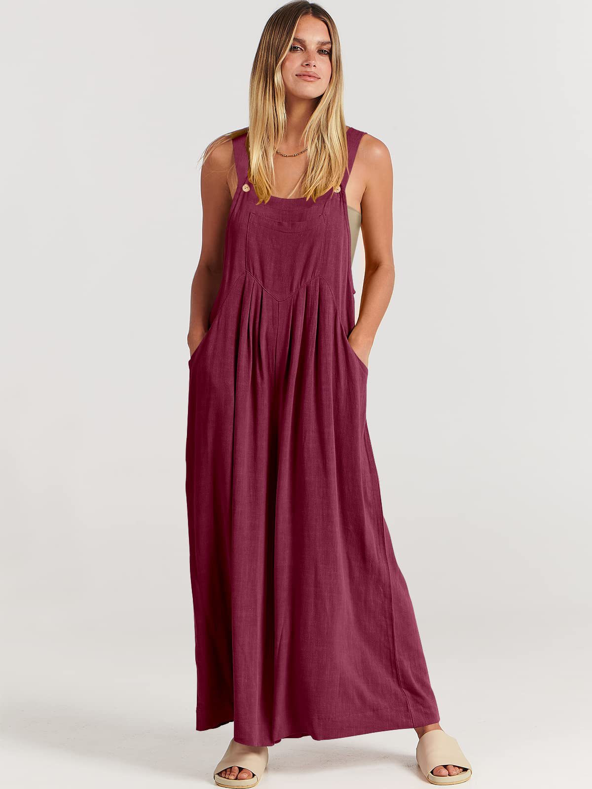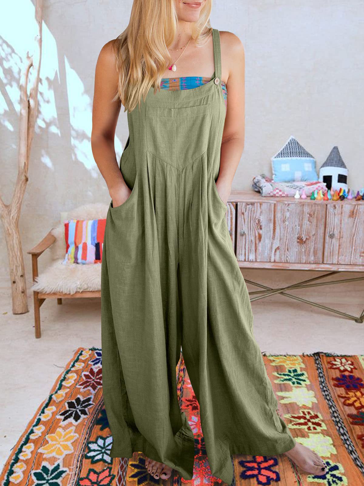 爆款獨立站歐美女士純色寬松休閒棉麻背帶連體褲