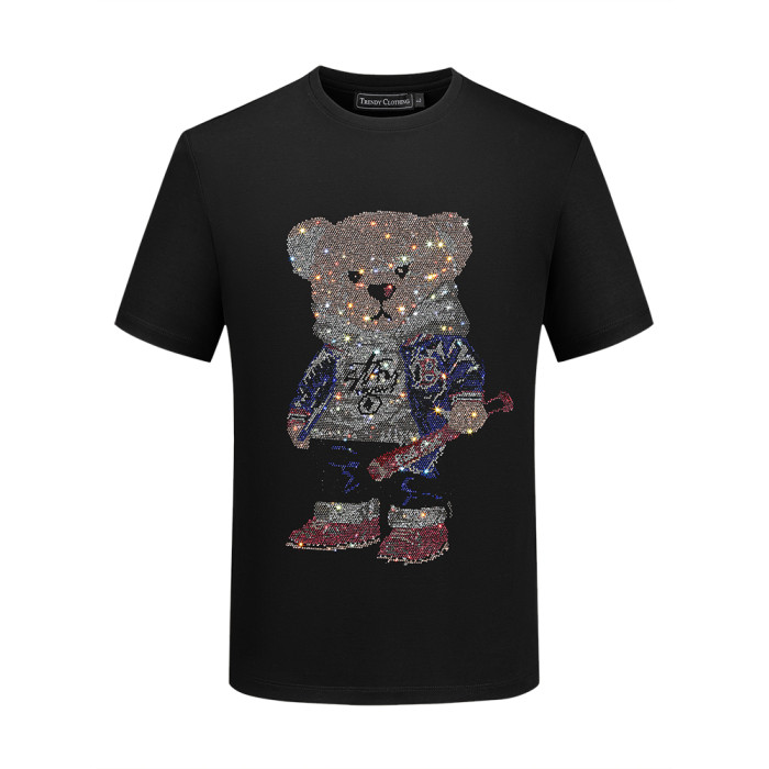 男士打底衫秋冬款2025新款燙鑽小熊加絨短袖男t恤歐洲站彈力半袖