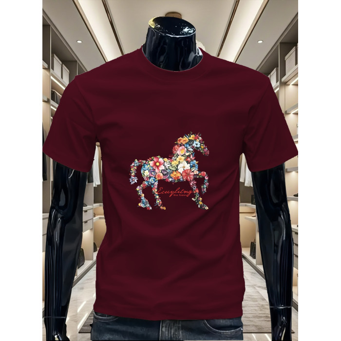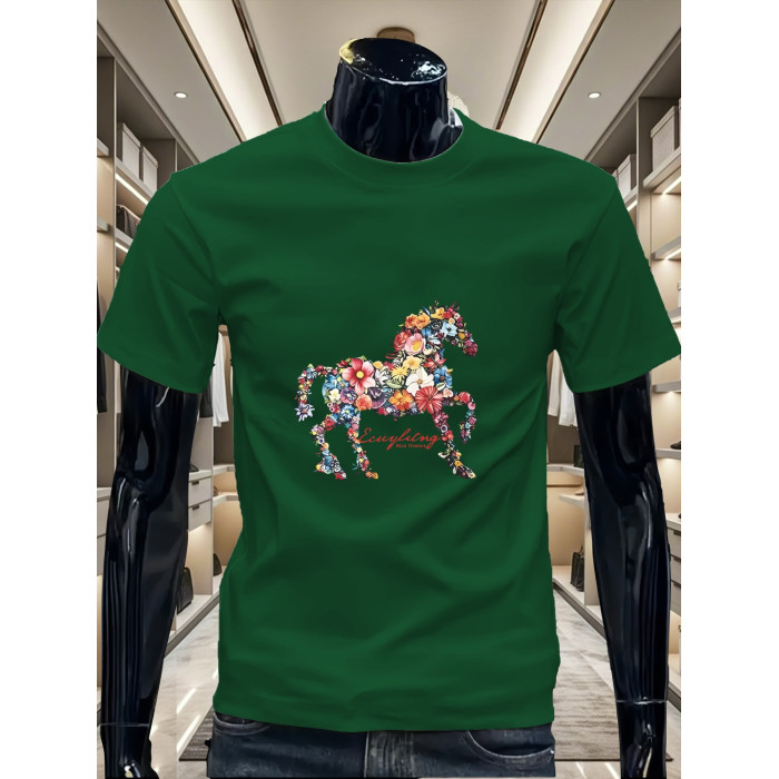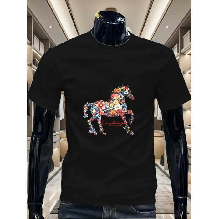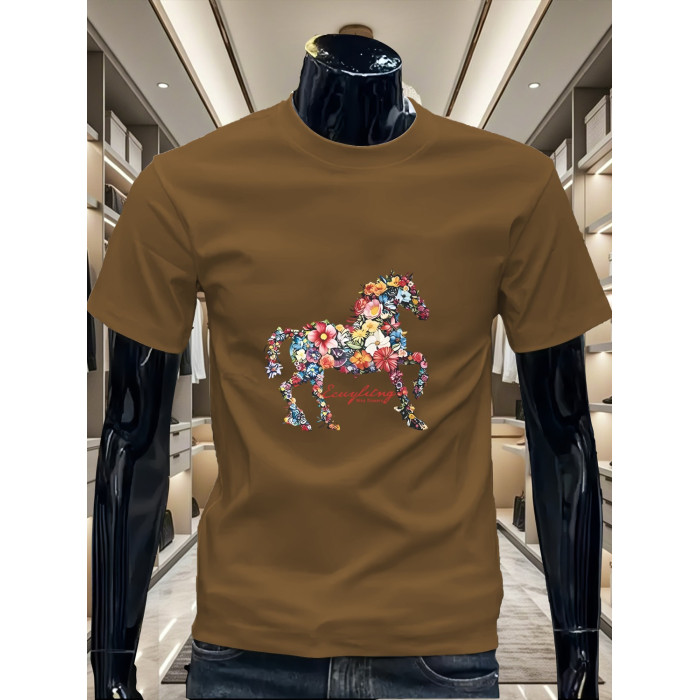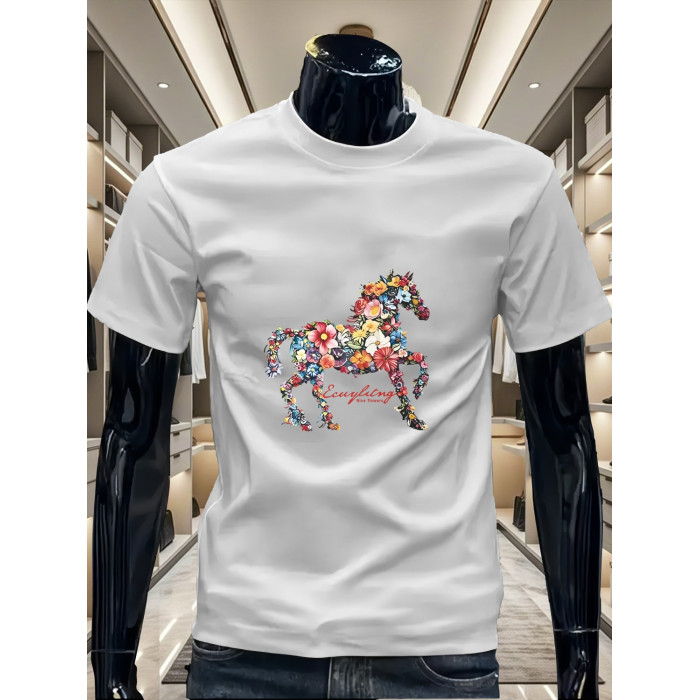 2025夏季新款純棉短袖男T恤網紅彩色花馬印花半袖百搭情侶打底衫