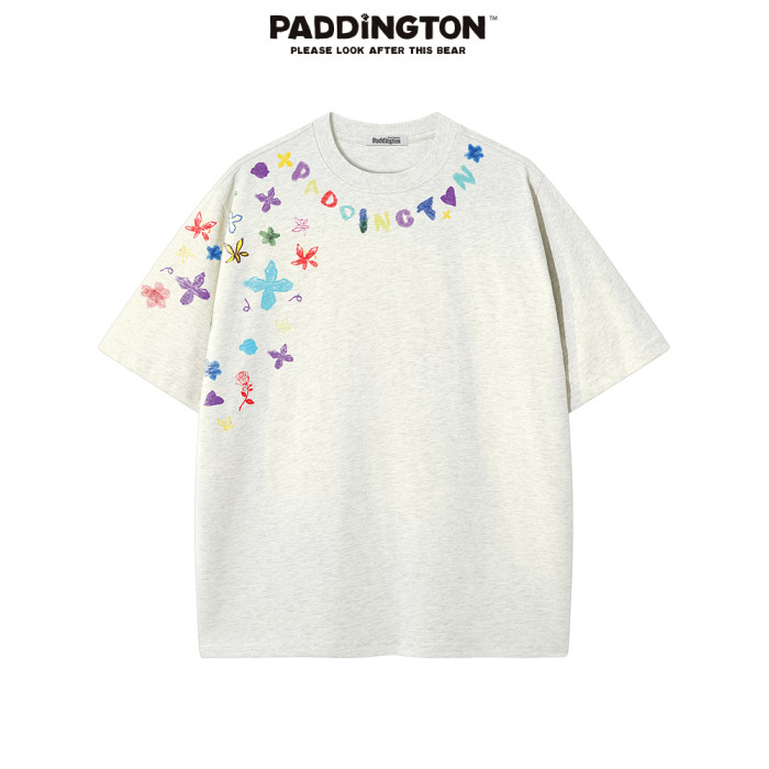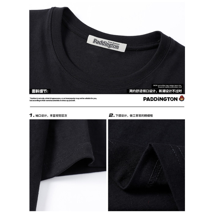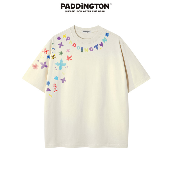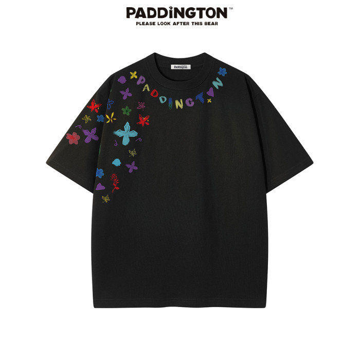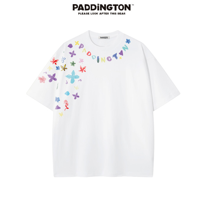 帕丁頓熊創意卡通塗鴉字母項鍊圖案美式圓領短袖T恤落肩男款