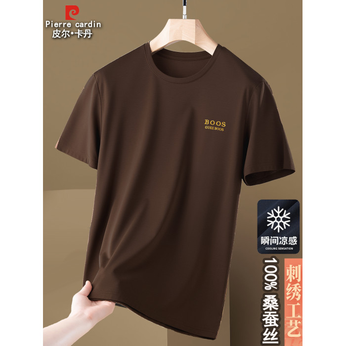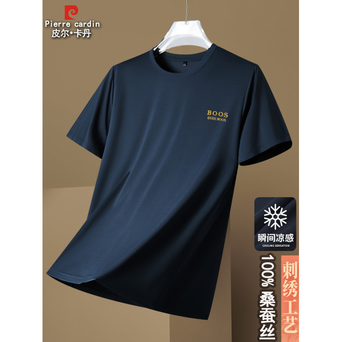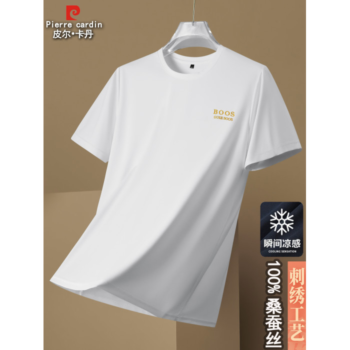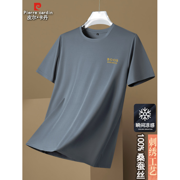 皮爾卡丹夏季短袖t恤男t恤圓領冰絲涼感上衣休閒桑蠶絲半袖體恤