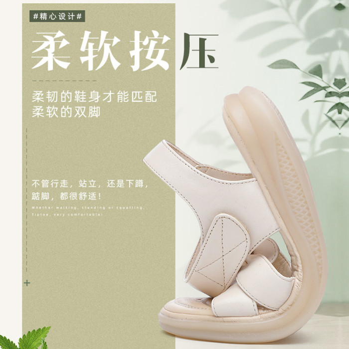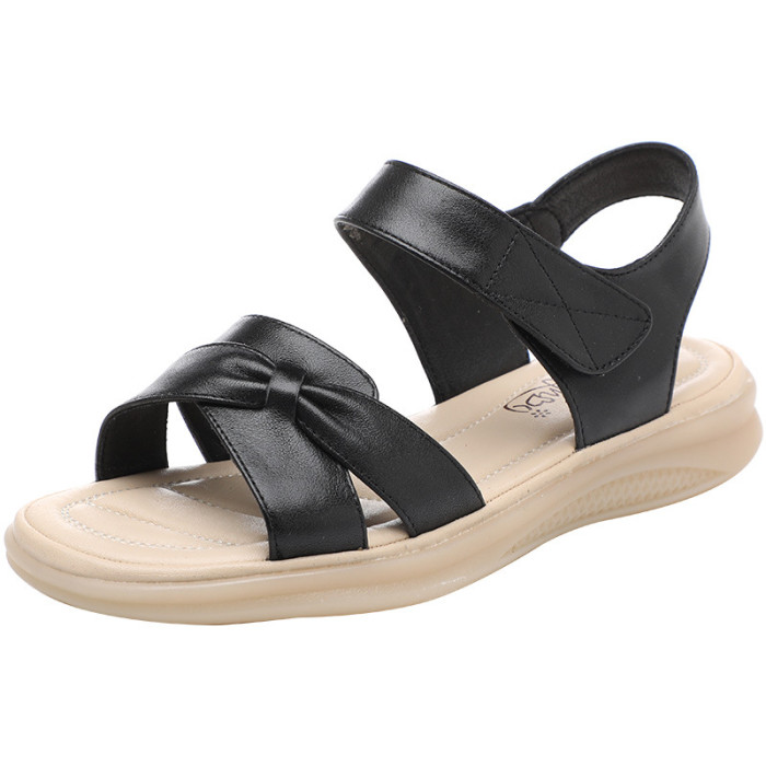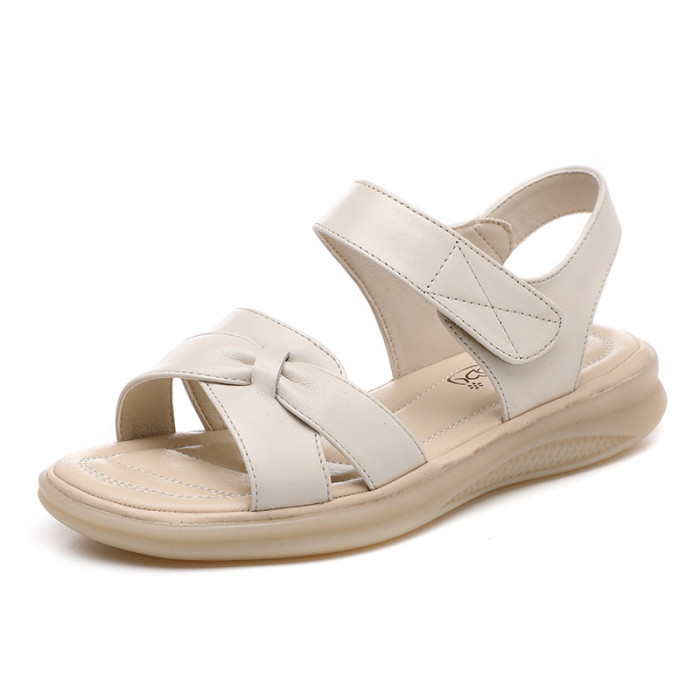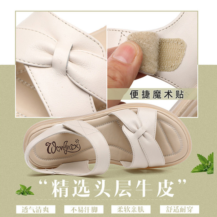 旺奈真皮軟底涼鞋女夏季平底防滑孕婦沙灘鞋中年大碼牛筋底媽媽鞋