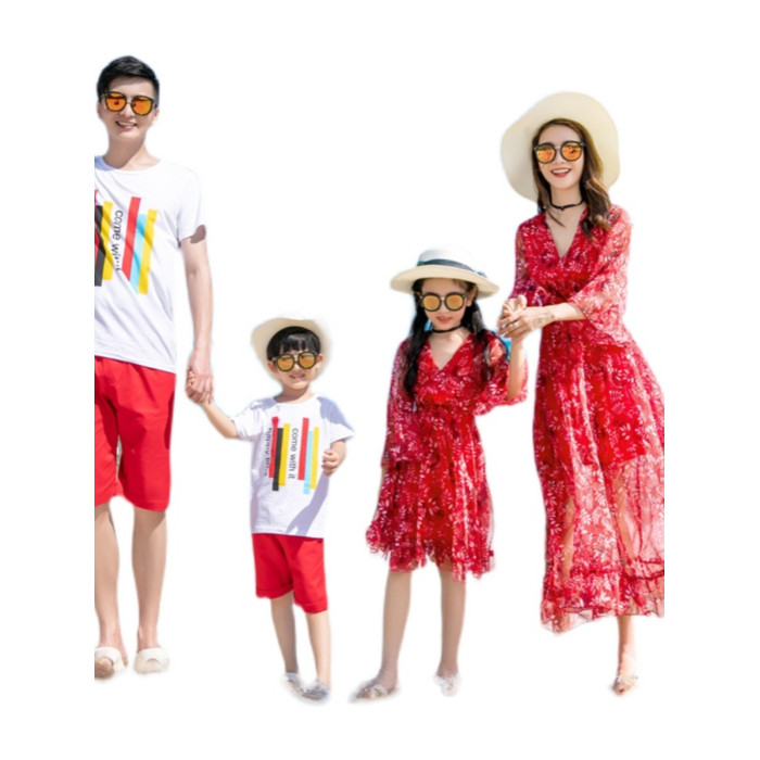 三亞雲南海邊度假親子裝母女連衣裙夏一家三四口紅色雪紡沙灘長裙