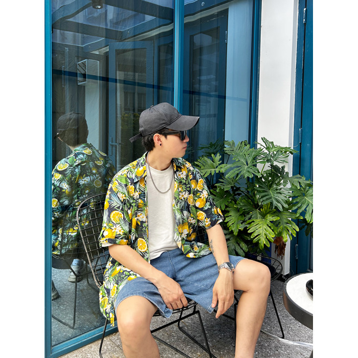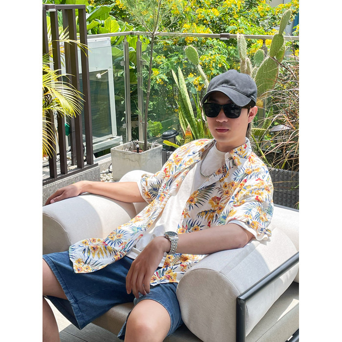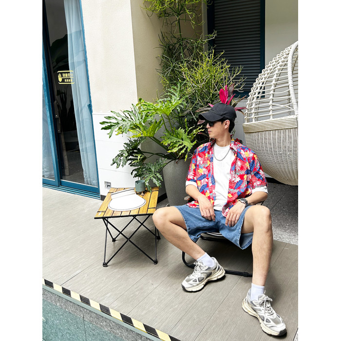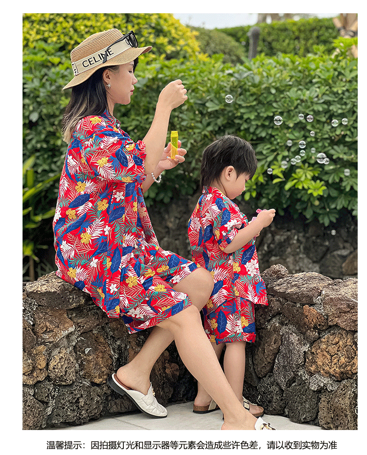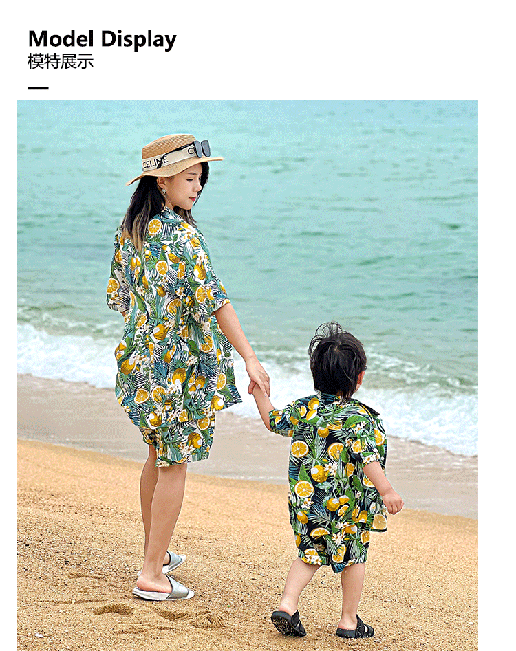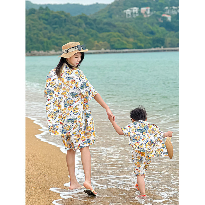 海南度假親子裝花襯衫套裝2024新款輕薄透氣男童花襯衣短袖翻領潮