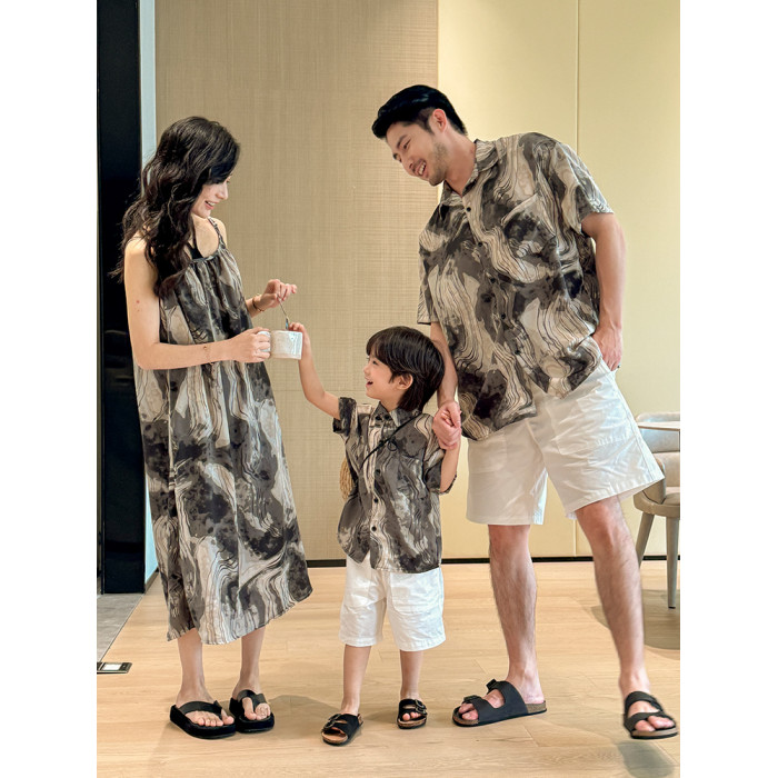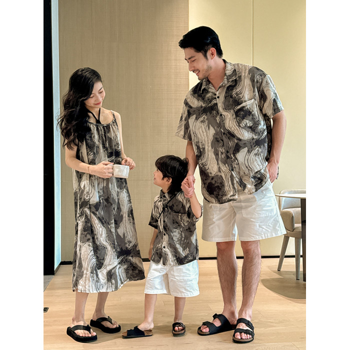 親子裝一家三口夏季新款沙灘母女吊帶連衣裙海邊度假母子休閒襯衫