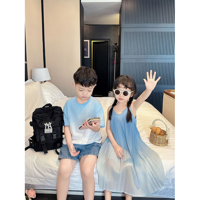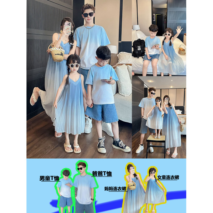 高級親子裝一家三口夏裝母子母女裝小月齡嬰兒短袖T恤漸變連衣裙