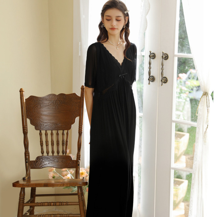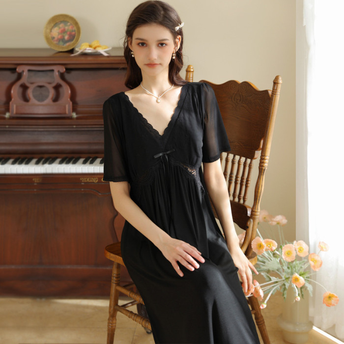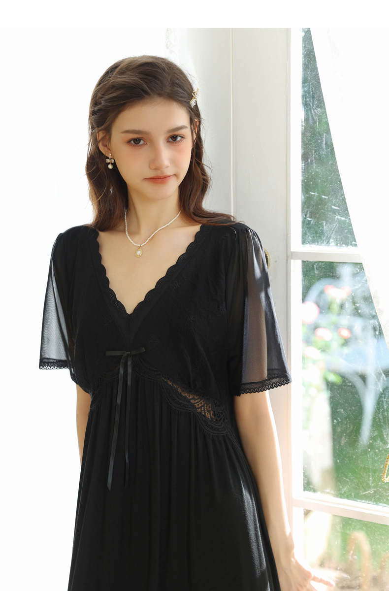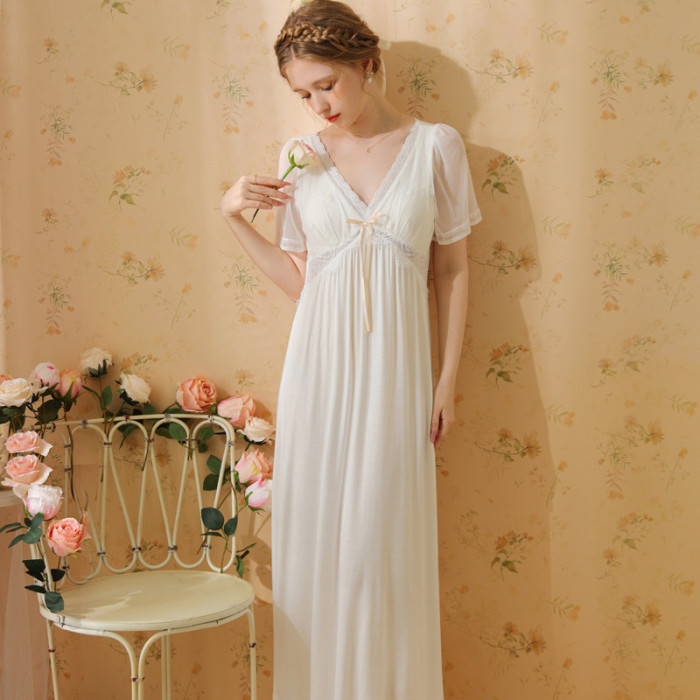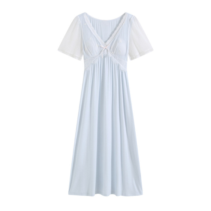 法式公主睡裙夏季少女短袖長款蕾絲性感純欲v領甜美睡衣帶胸墊
