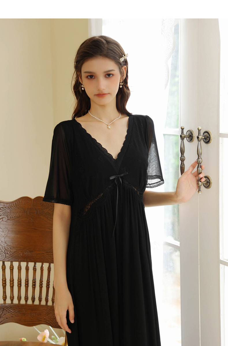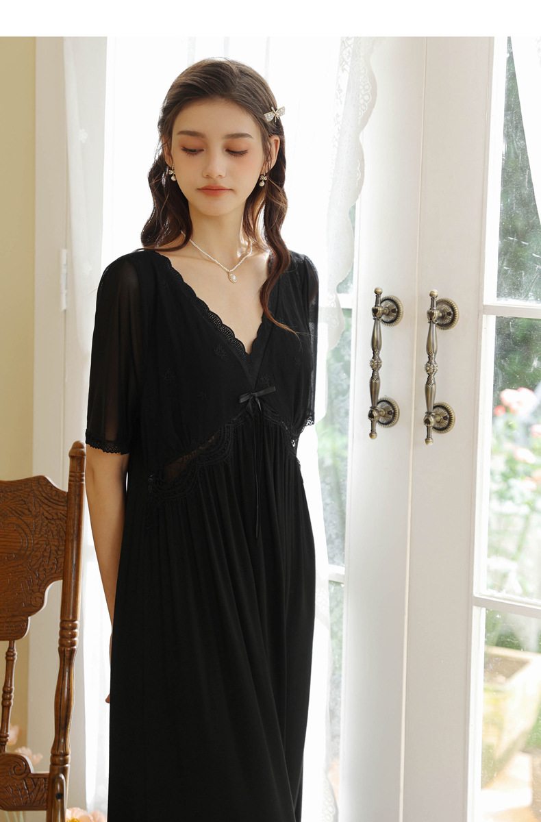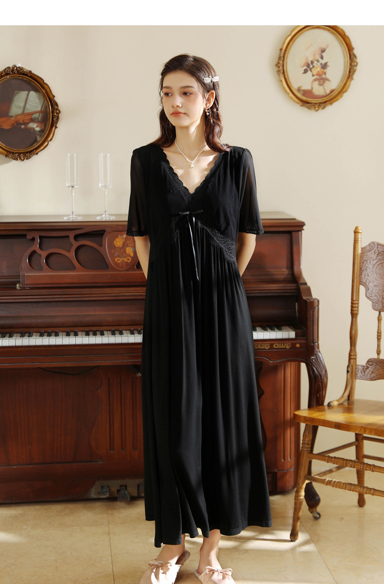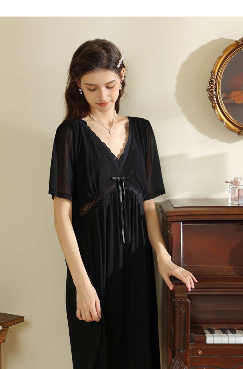 法式公主睡裙夏季少女短袖長款蕾絲性感純欲v領甜美睡衣帶胸墊
