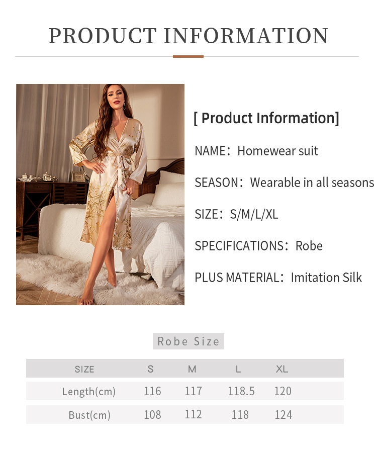 居家印花長袖睡袍 薄款性感女士系帶晨袍 簡約開衫睡衣冰絲浴袍