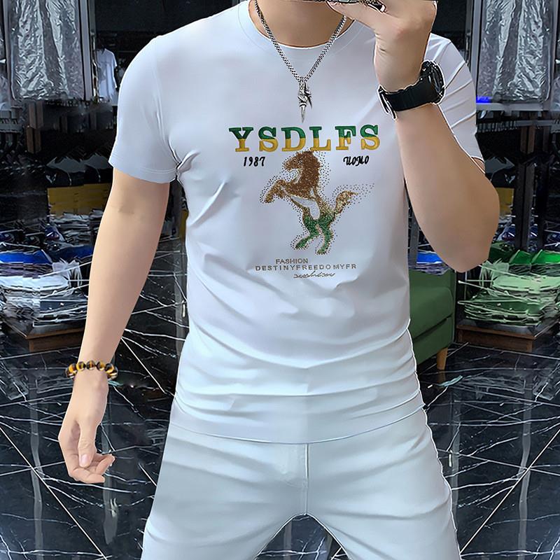歐美潮牌夏季刺綉戰馬輕奢修身短袖男T恤絲光棉彈力薄款青年體恤