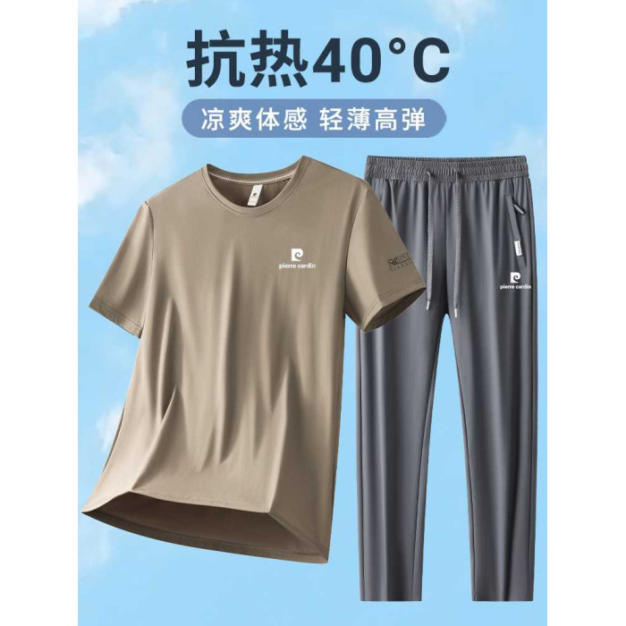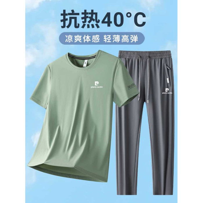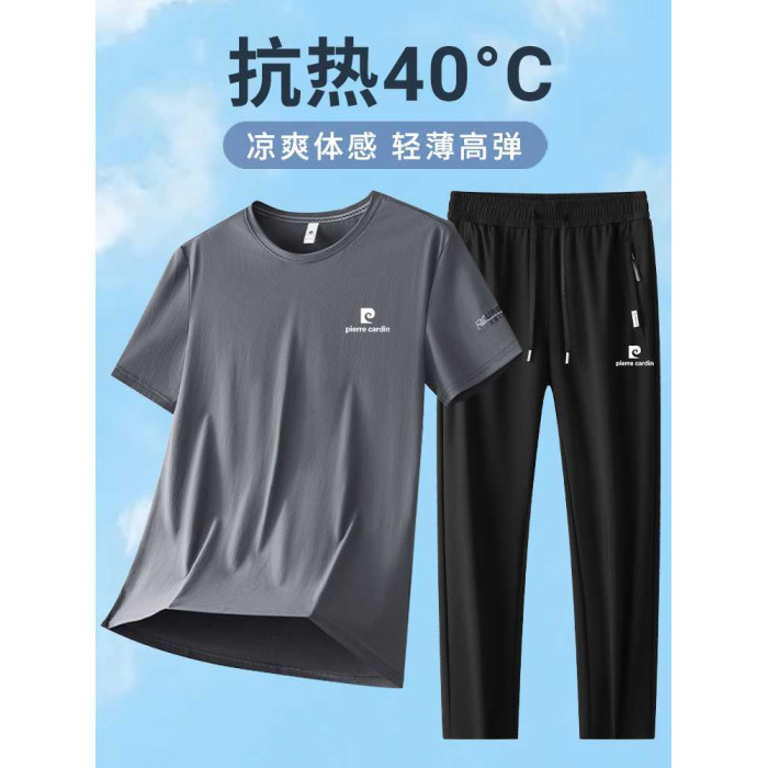 高級運動套裝男T恤夏季薄款體恤冰絲跑步運動服爸爸夏裝