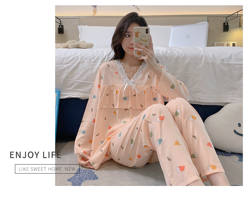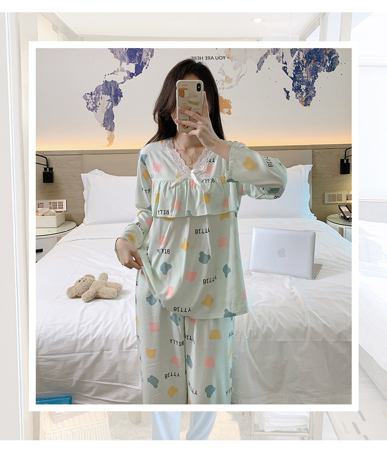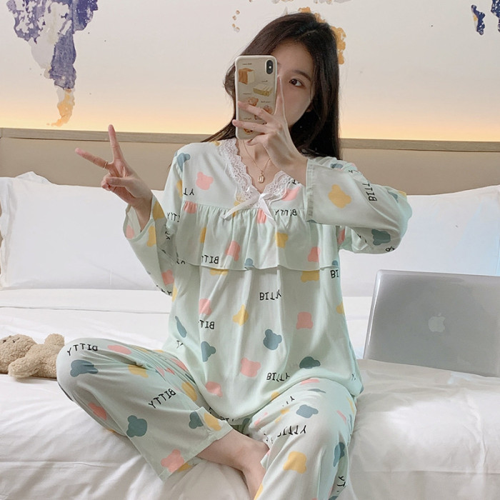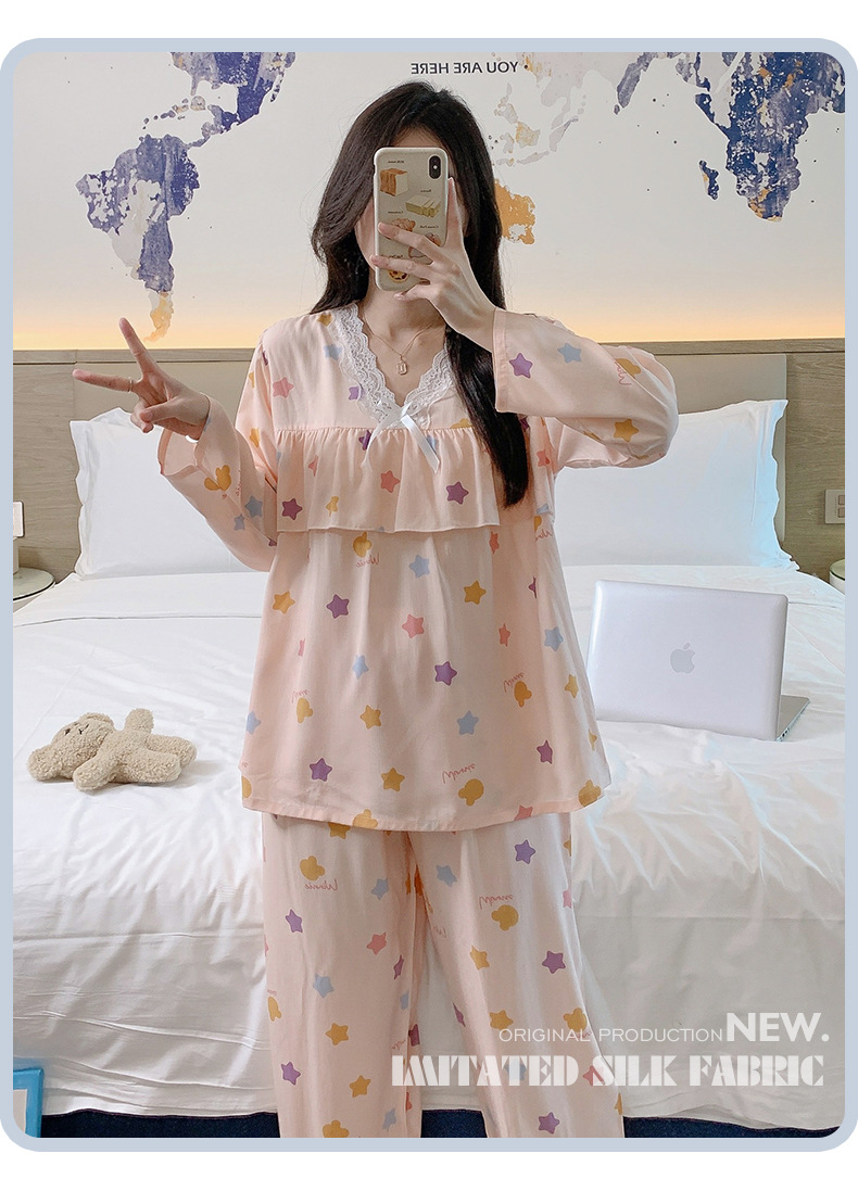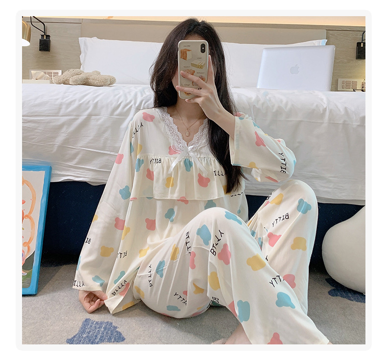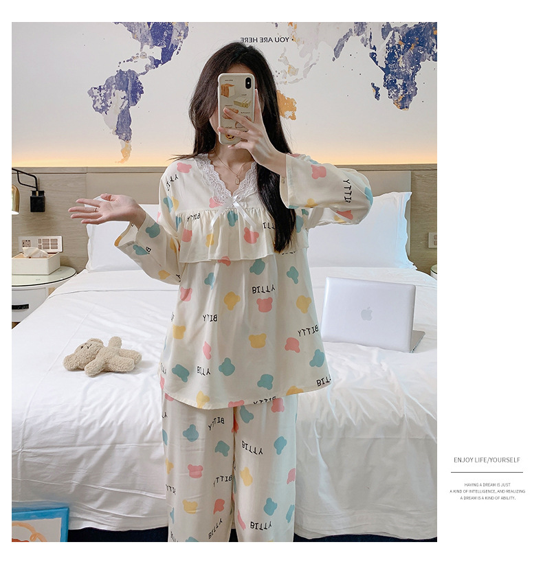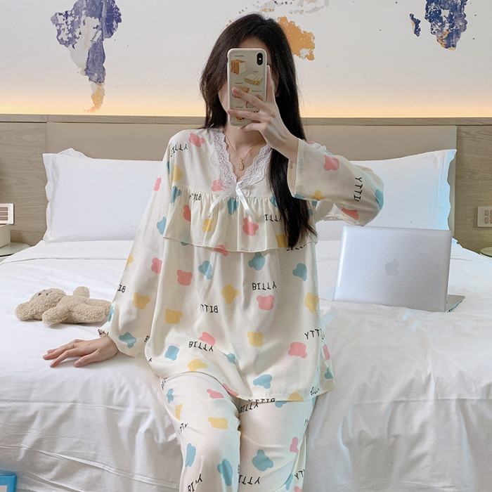 春秋女士棉綢睡衣蕾絲邊印花長袖長褲兩件套防凸點可愛薄款睡衣