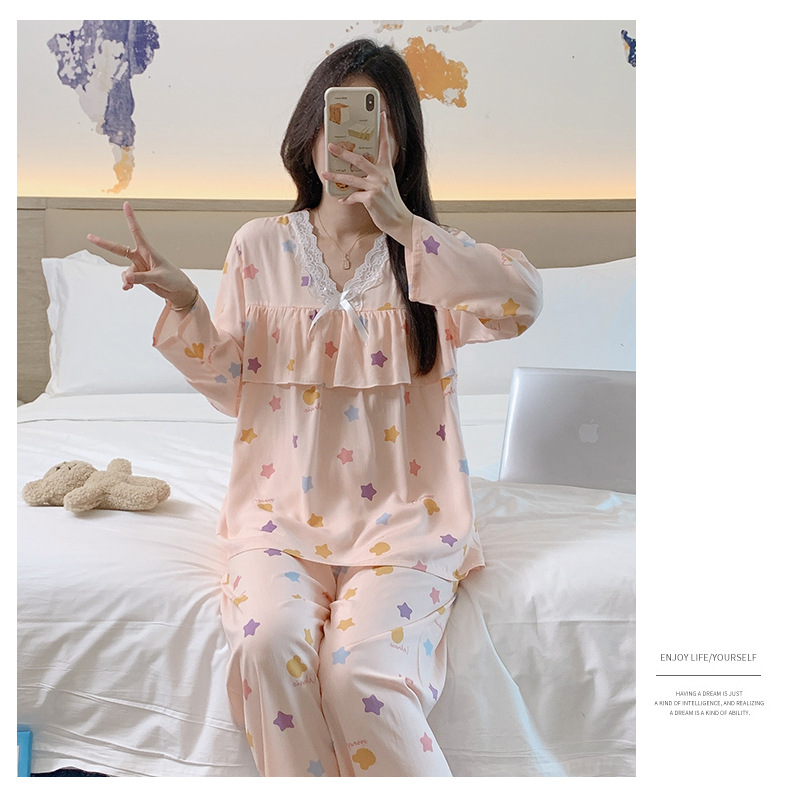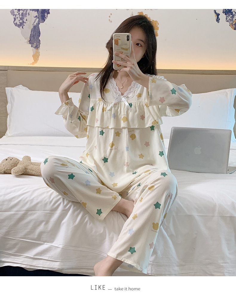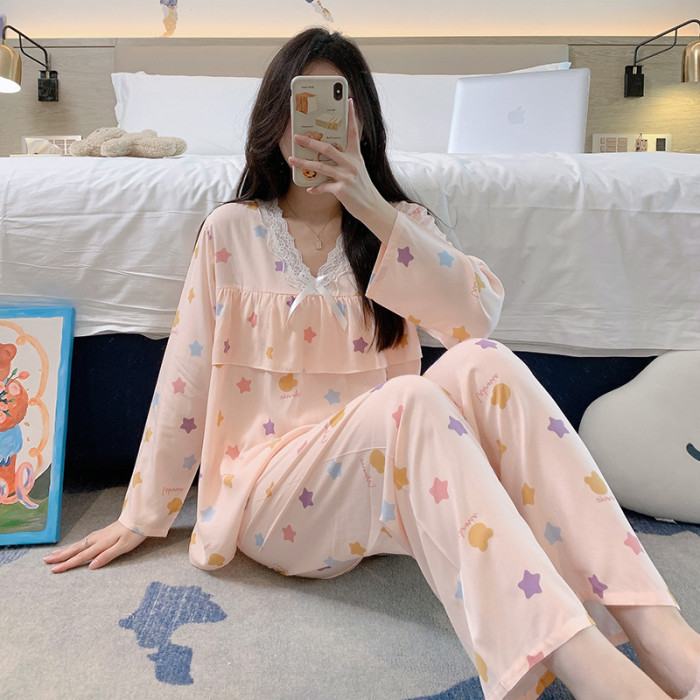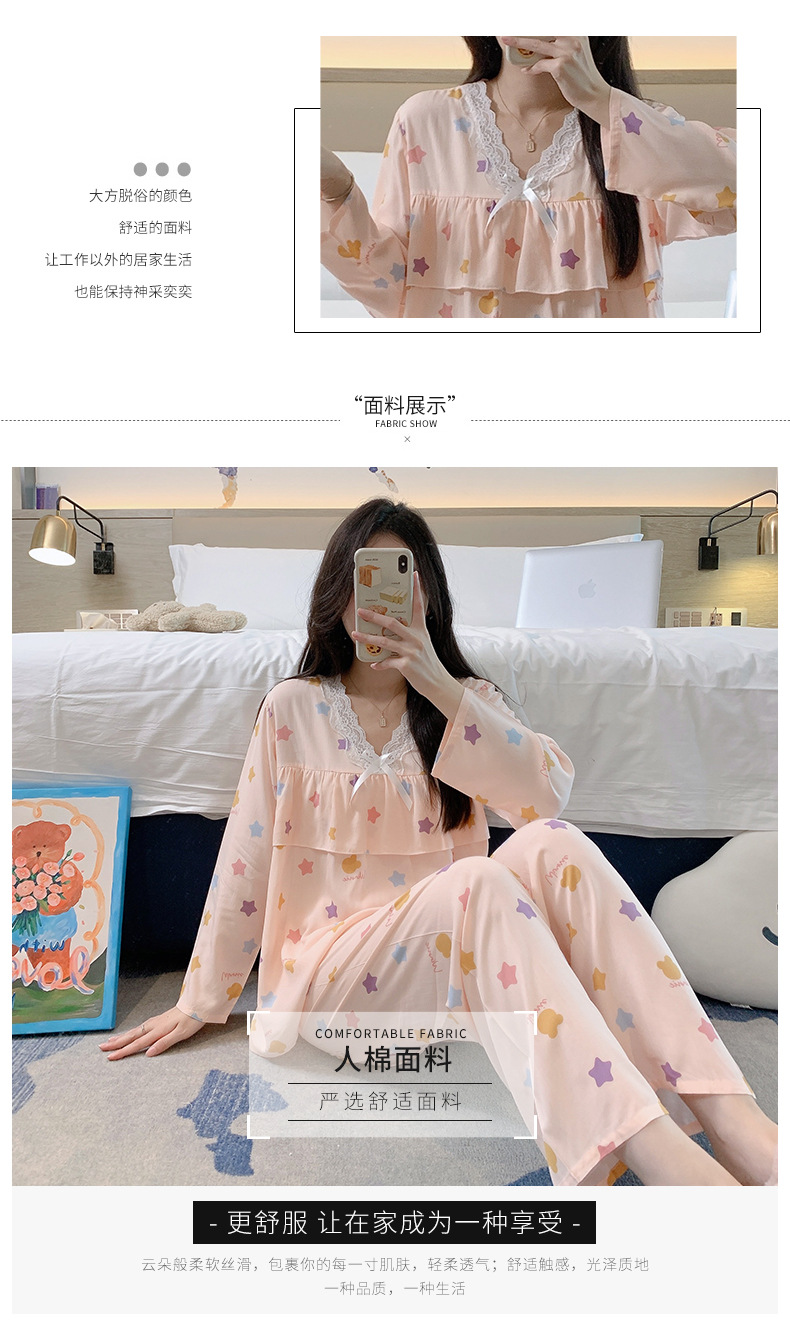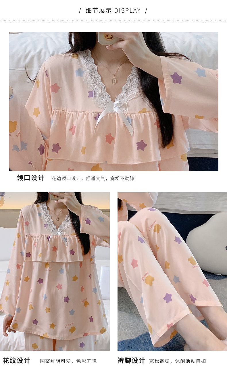春秋女士棉綢睡衣蕾絲邊印花長袖長褲兩件套防凸點可愛薄款睡衣