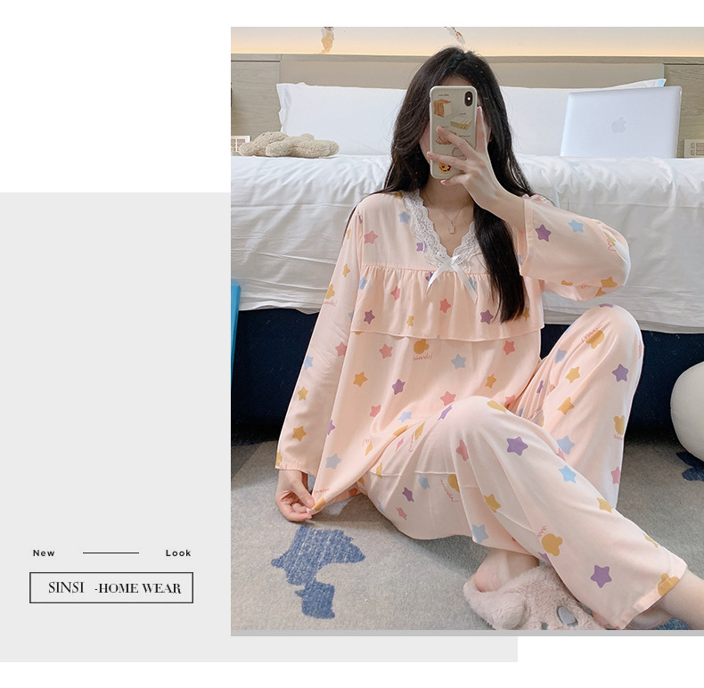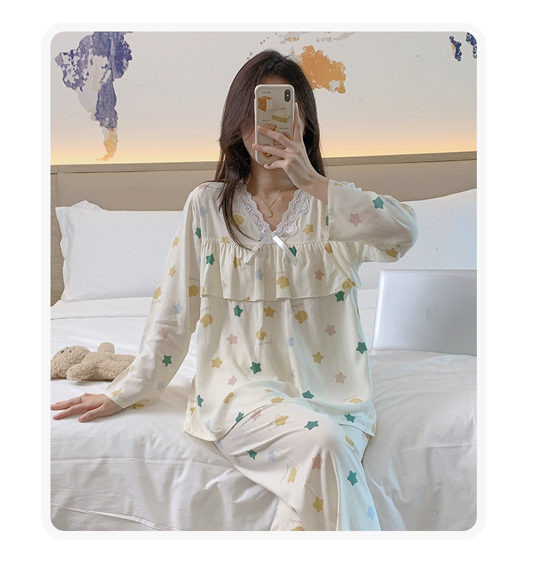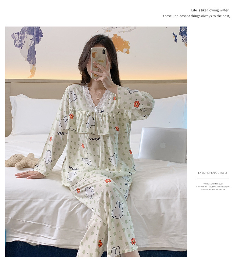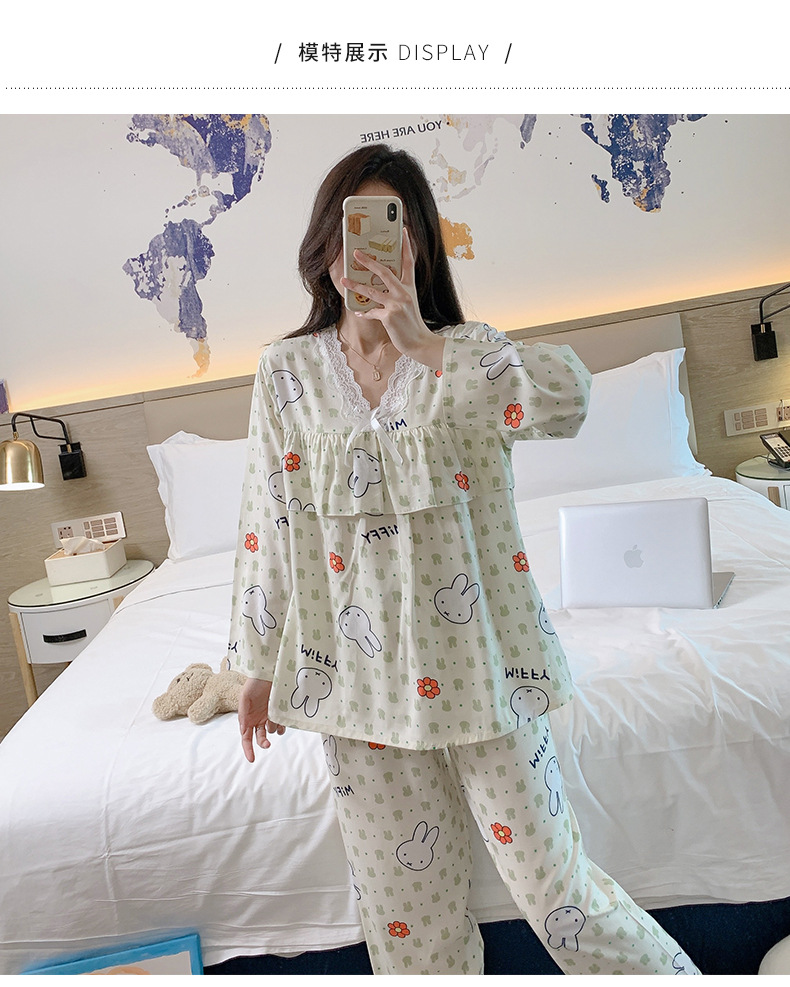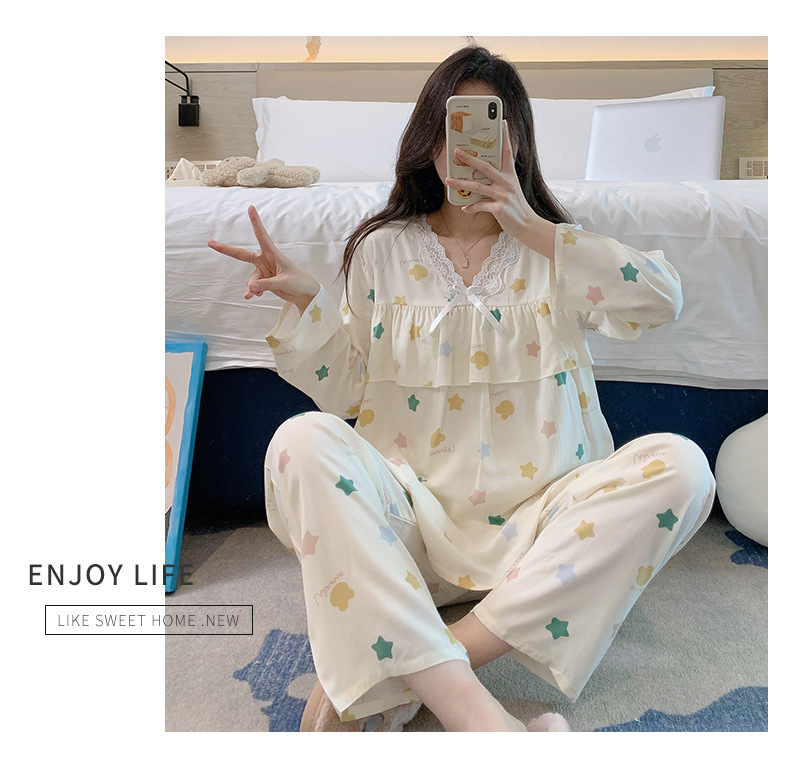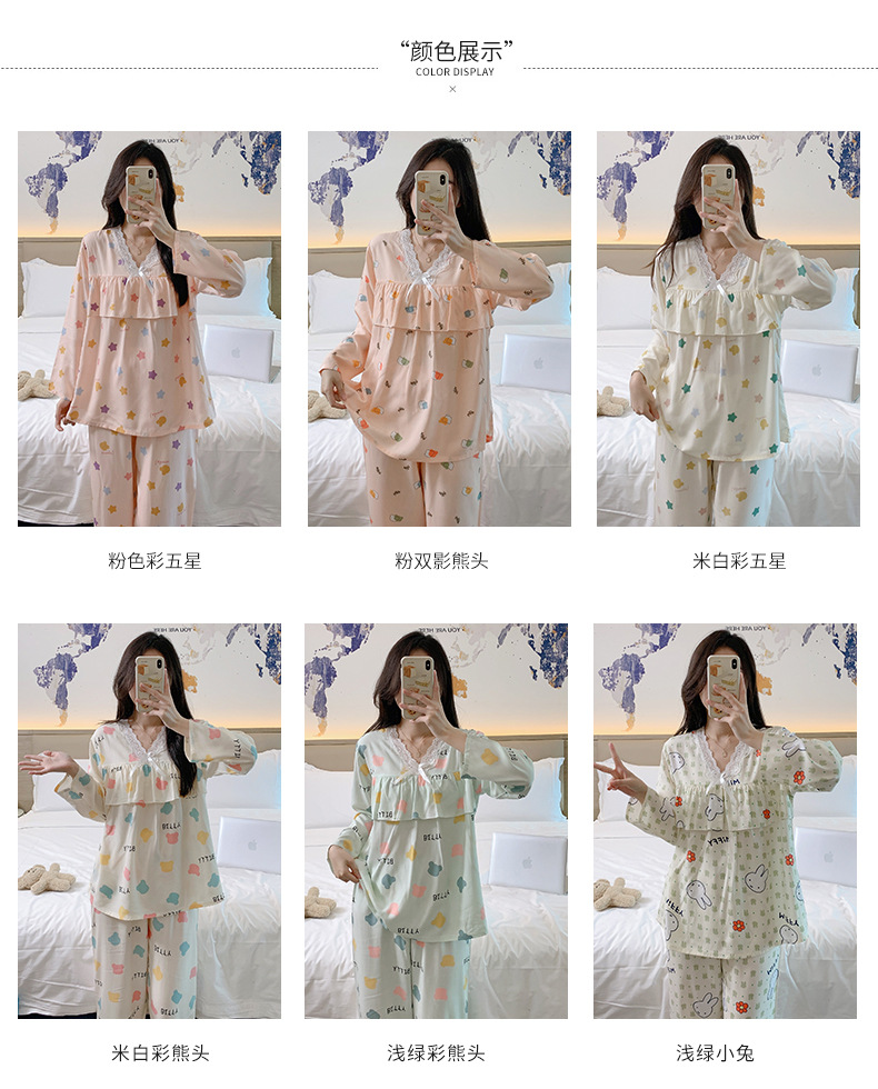 春秋女士棉綢睡衣蕾絲邊印花長袖長褲兩件套防凸點可愛薄款睡衣
