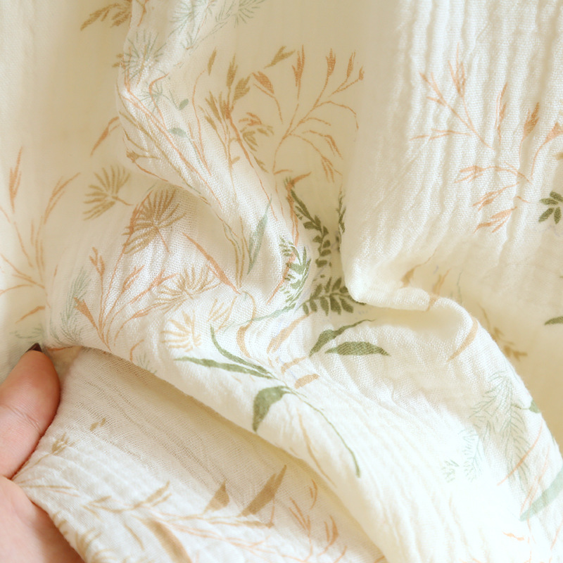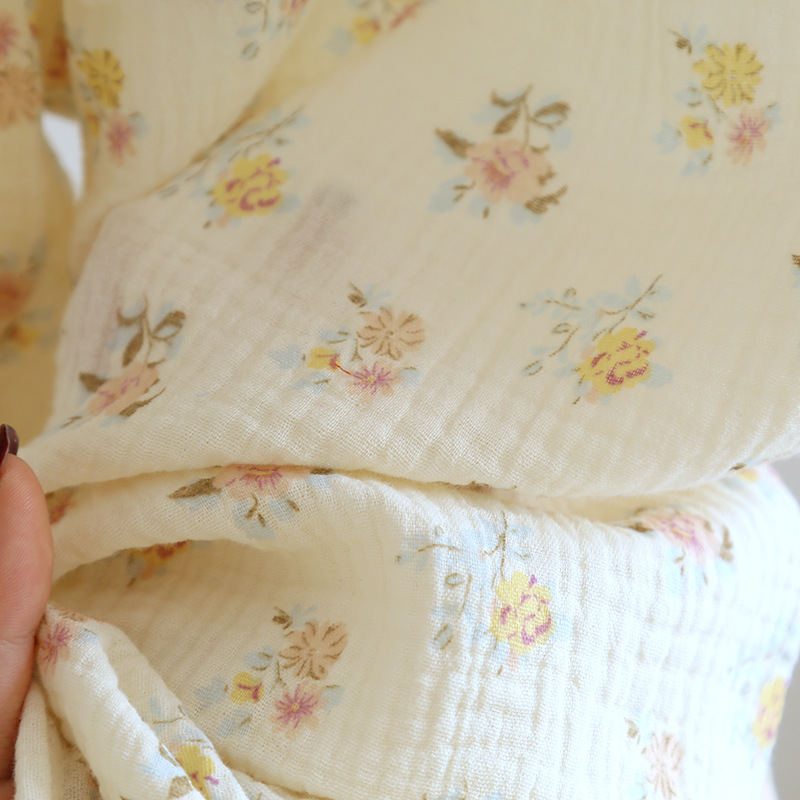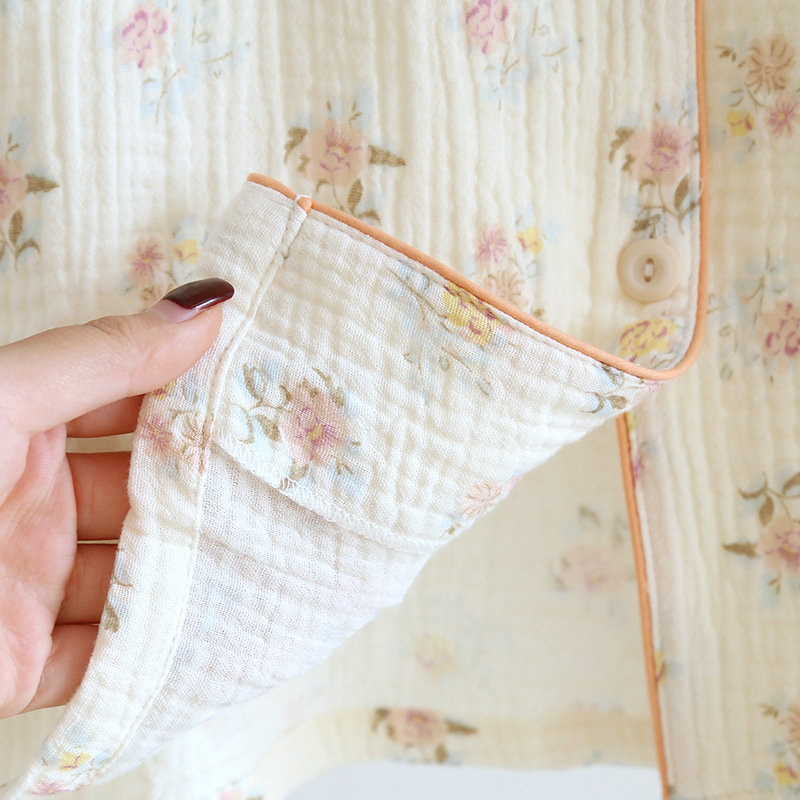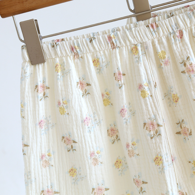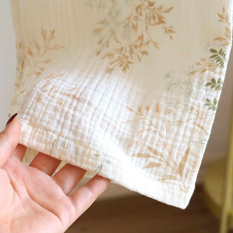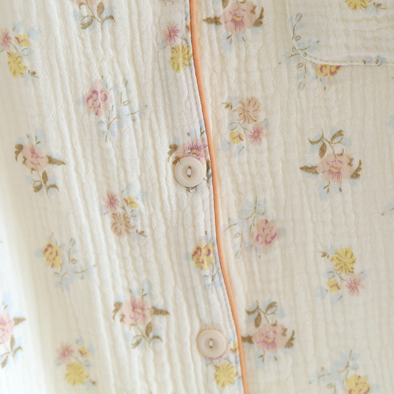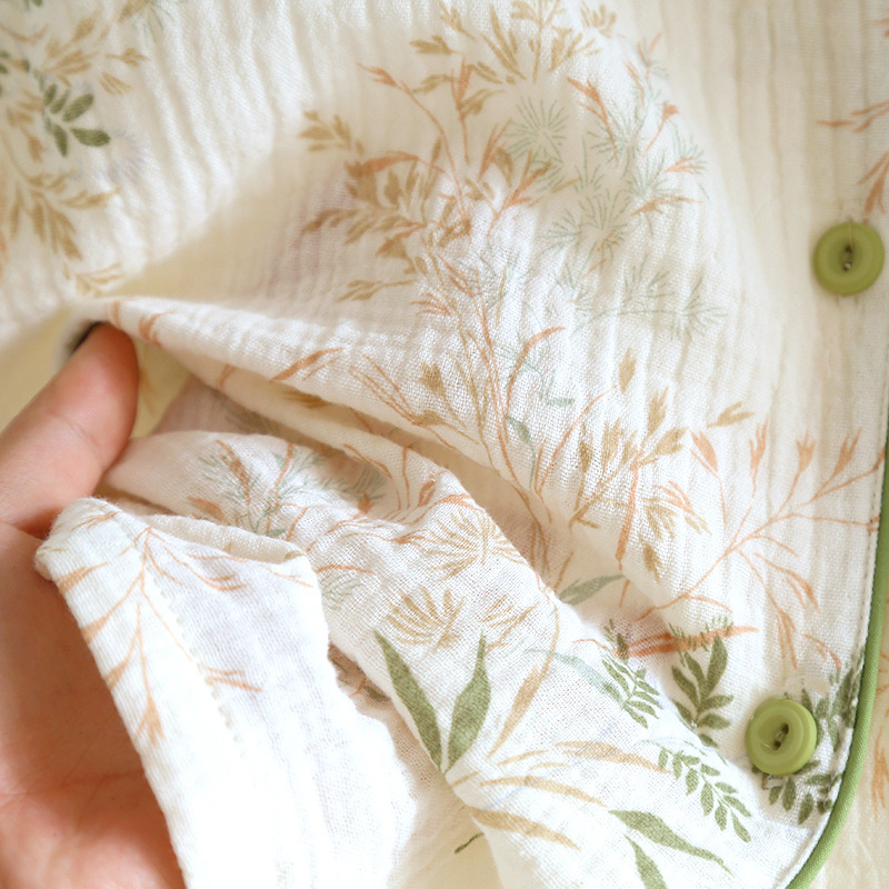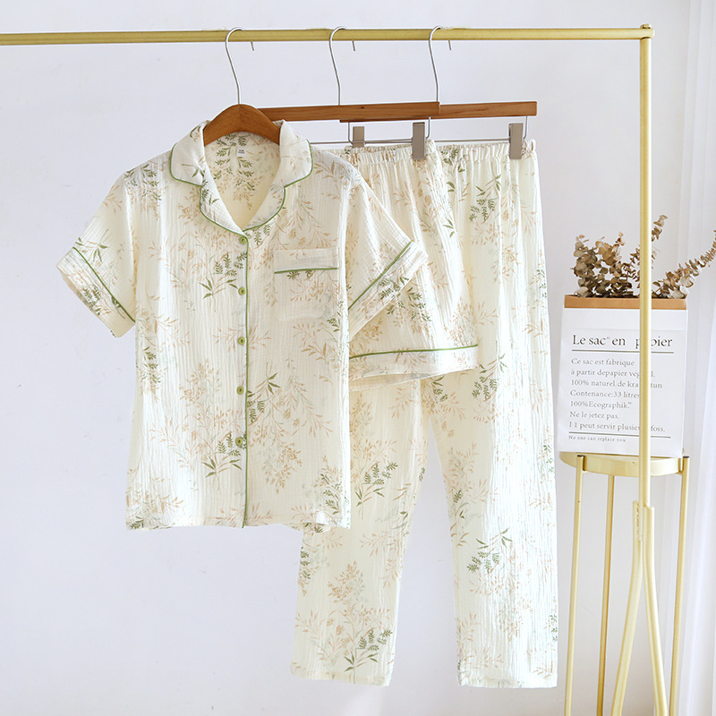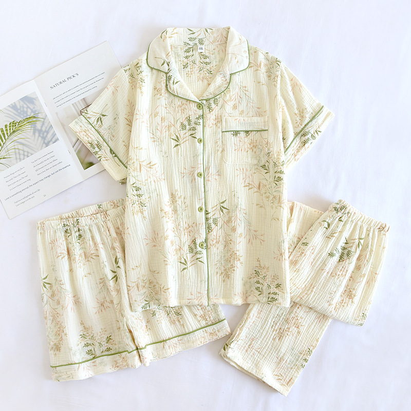 春夏薄款純棉紗布睡衣三件套女士短袖長褲縐布棉家居服套裝