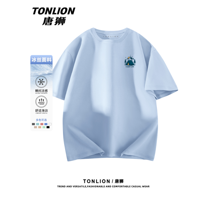 唐獅短袖男t恤2025新款夏季簡約百搭冰絲半袖多巴胺藍色寬松體恤