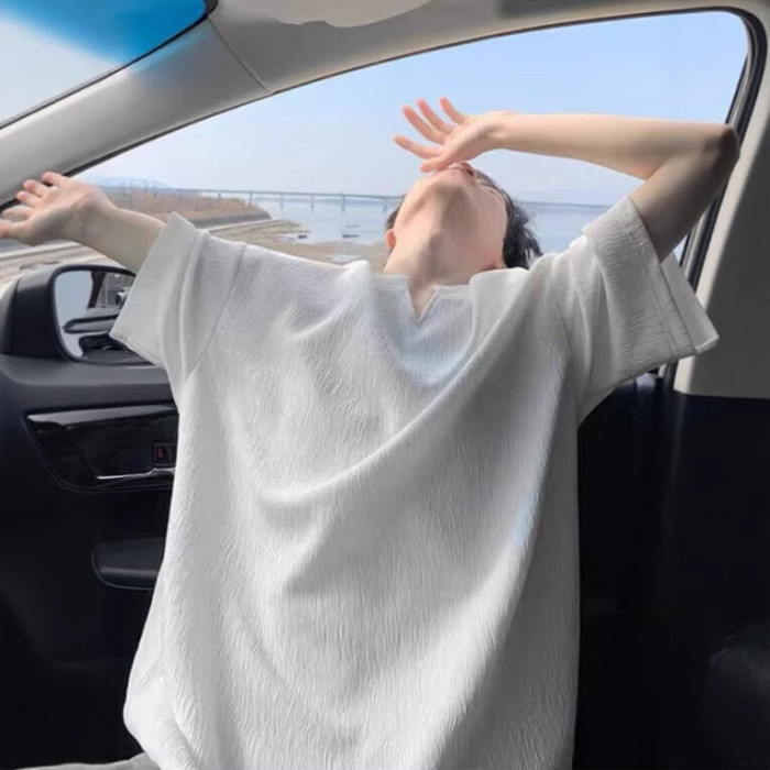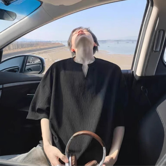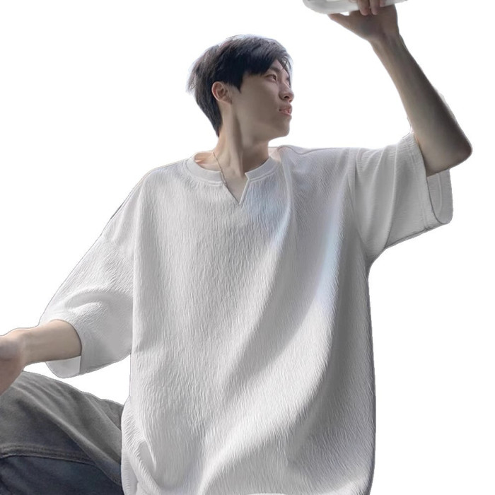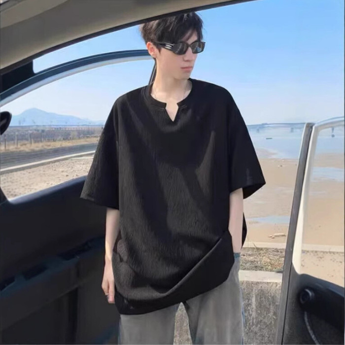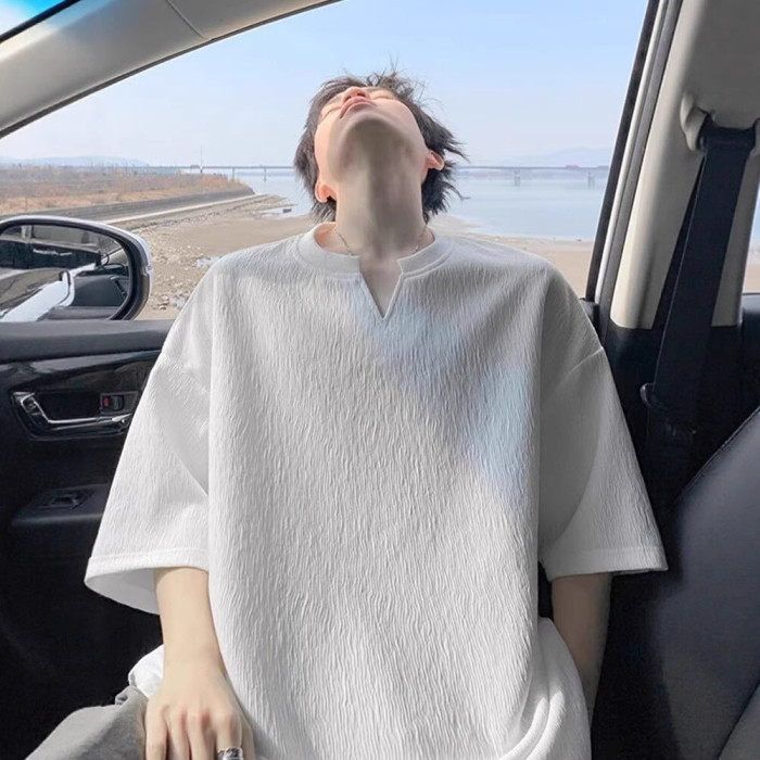 肌理感V領短袖男t恤夏季潮牌半袖青少年衣服2025新款寬松體恤男裝