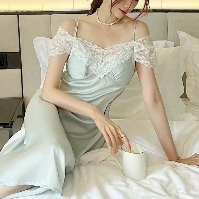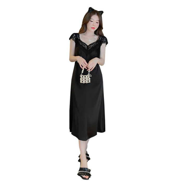 性感睡衣女夏季冰絲薄款吊帶短袖蕾絲中長款高級感純欲帶胸墊睡裙