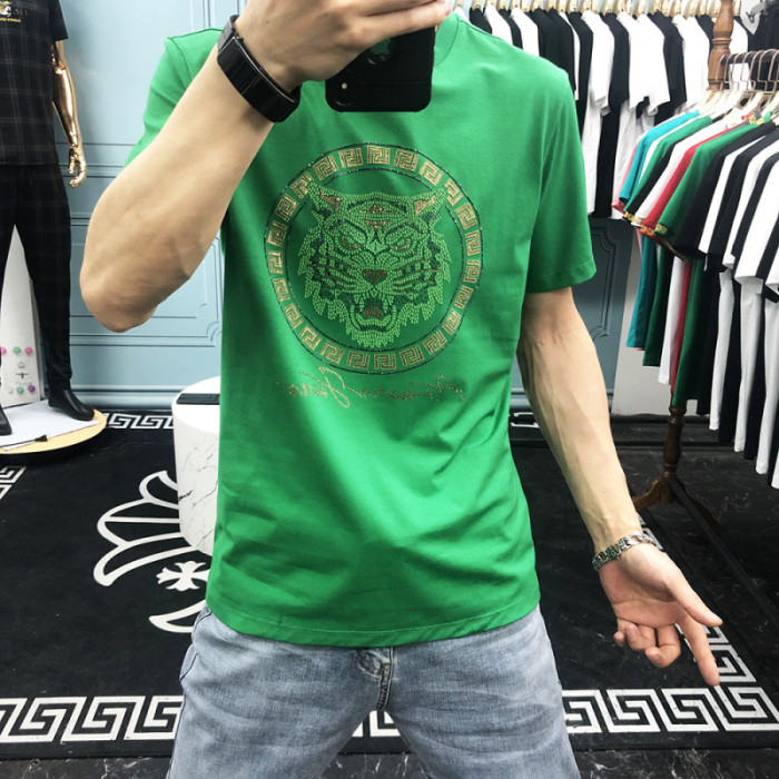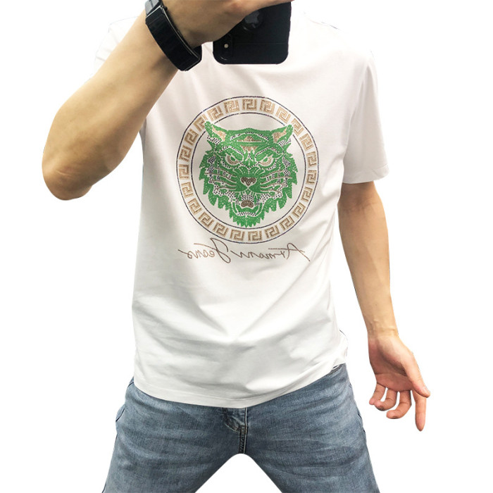 短袖男T恤大碼男裝2022綠色老虎頭燙鑽60支絲光棉輕奢歐貨體恤衫
