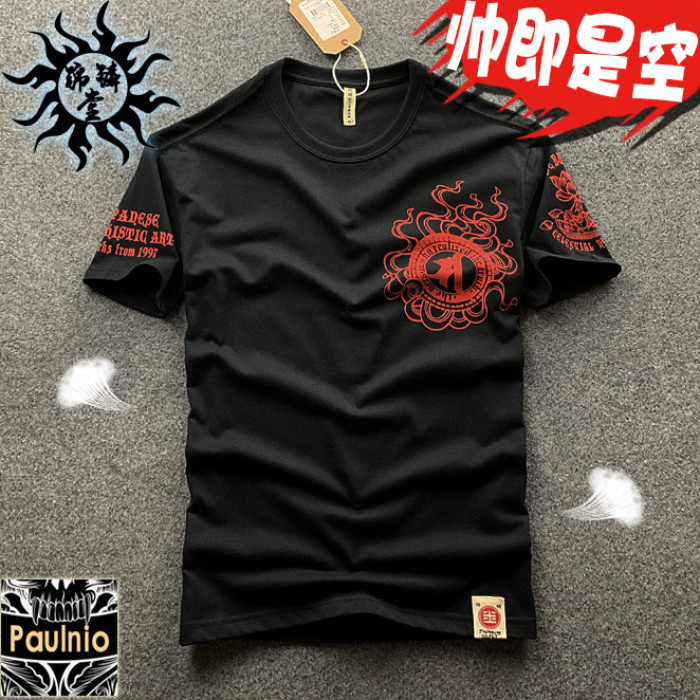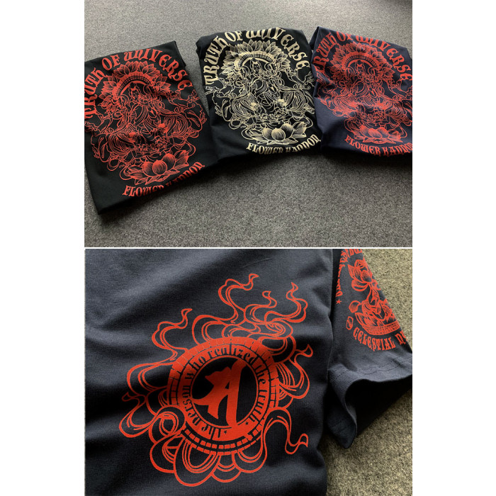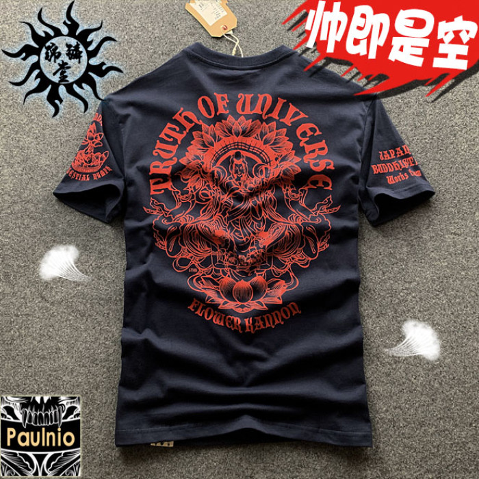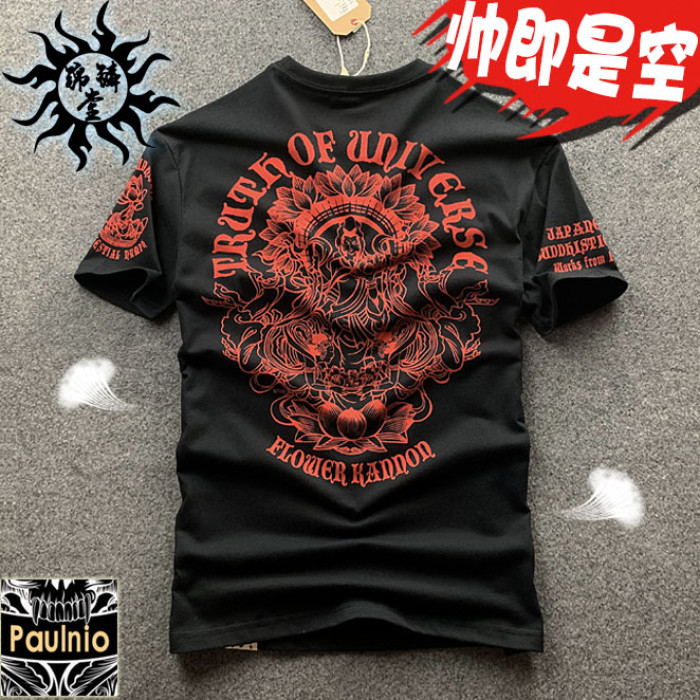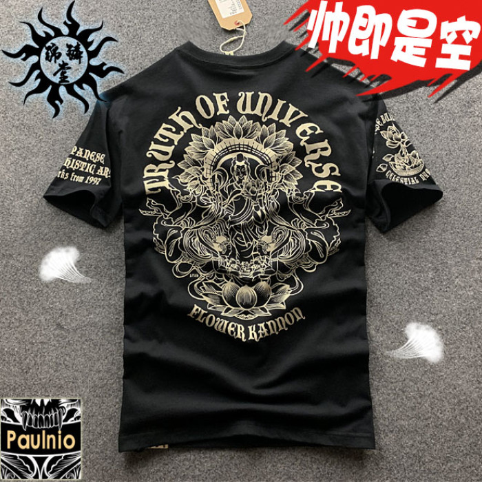 日系潮牌浮世繪蓮花觀音紋身純棉短袖 男t恤復古梵文潮流歐美街頭