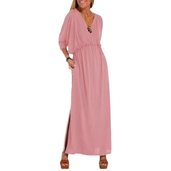 2024歐美夏季新品 獨立站時尚純色高腰開叉V領連衣裙