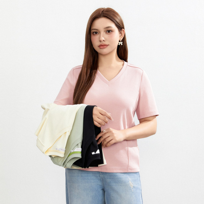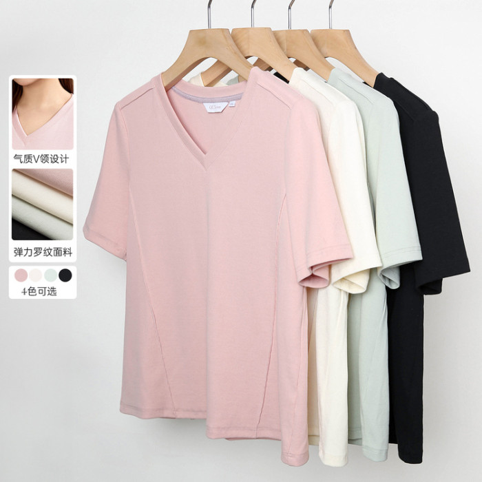 纖莉秀大碼女裝簡約百搭休閒減齡正肩V領顯瘦百搭T恤2024春裝新款